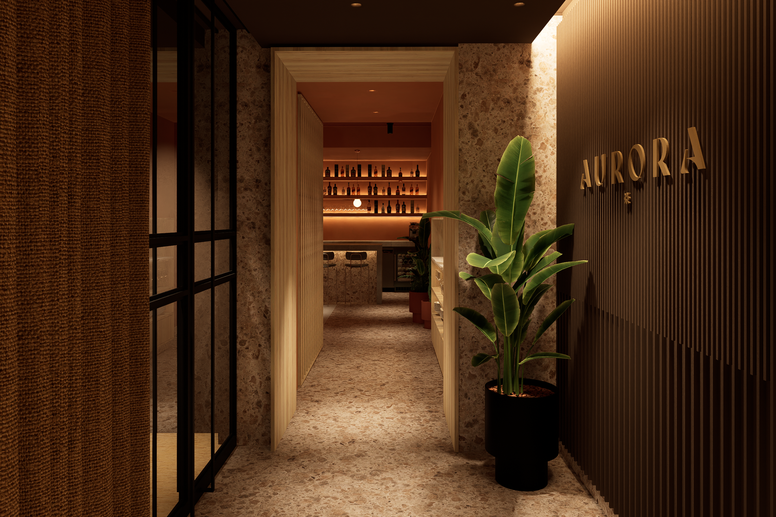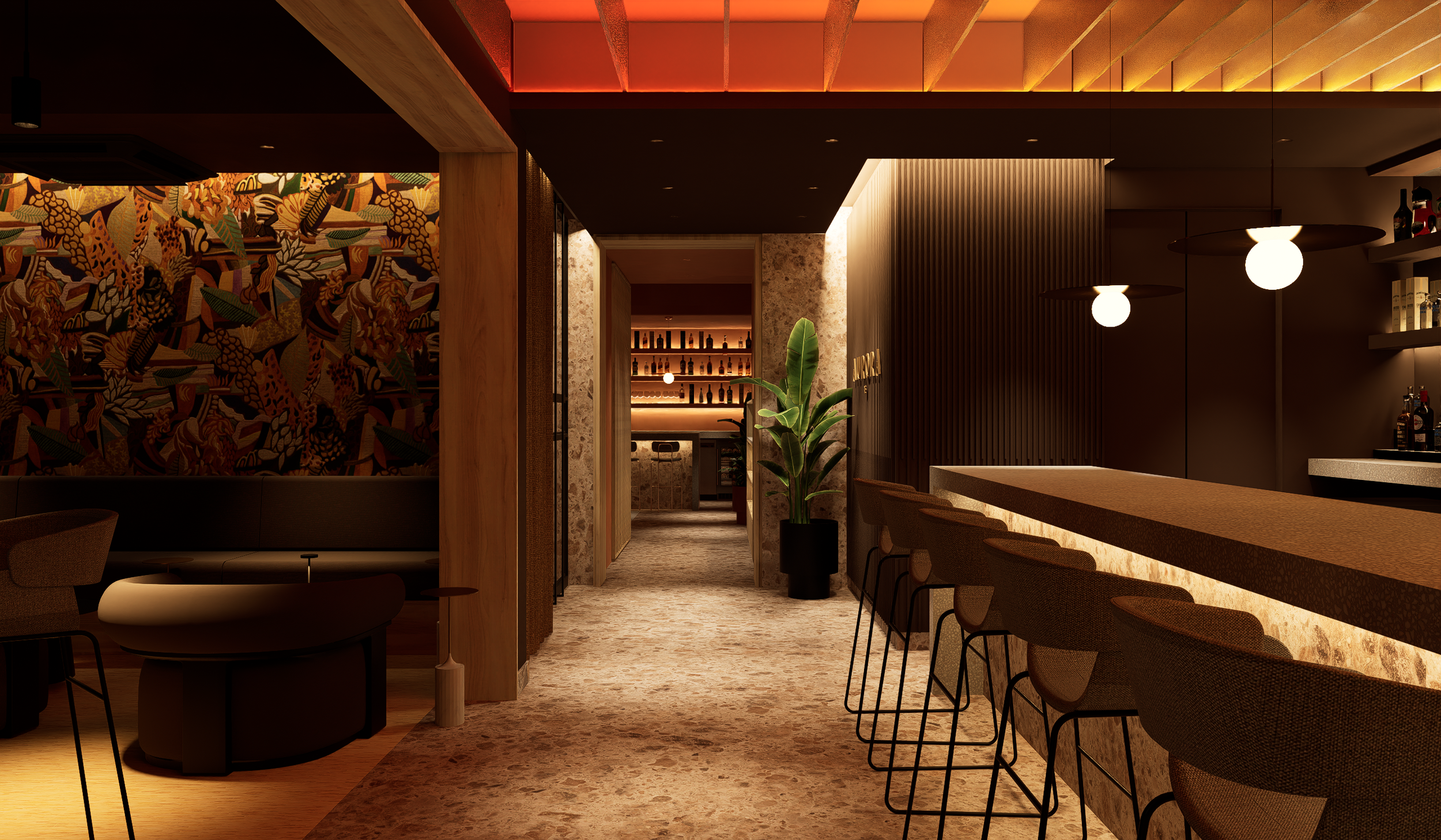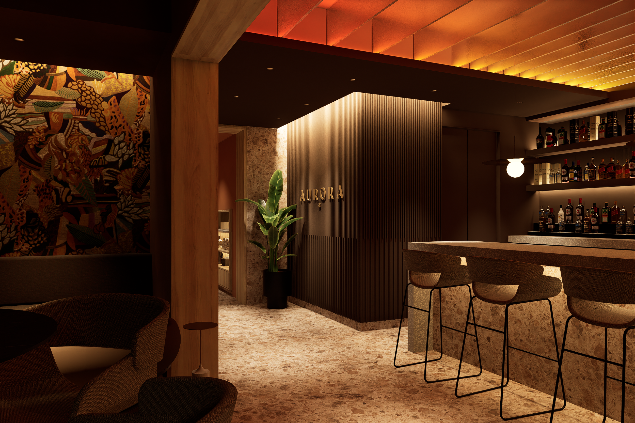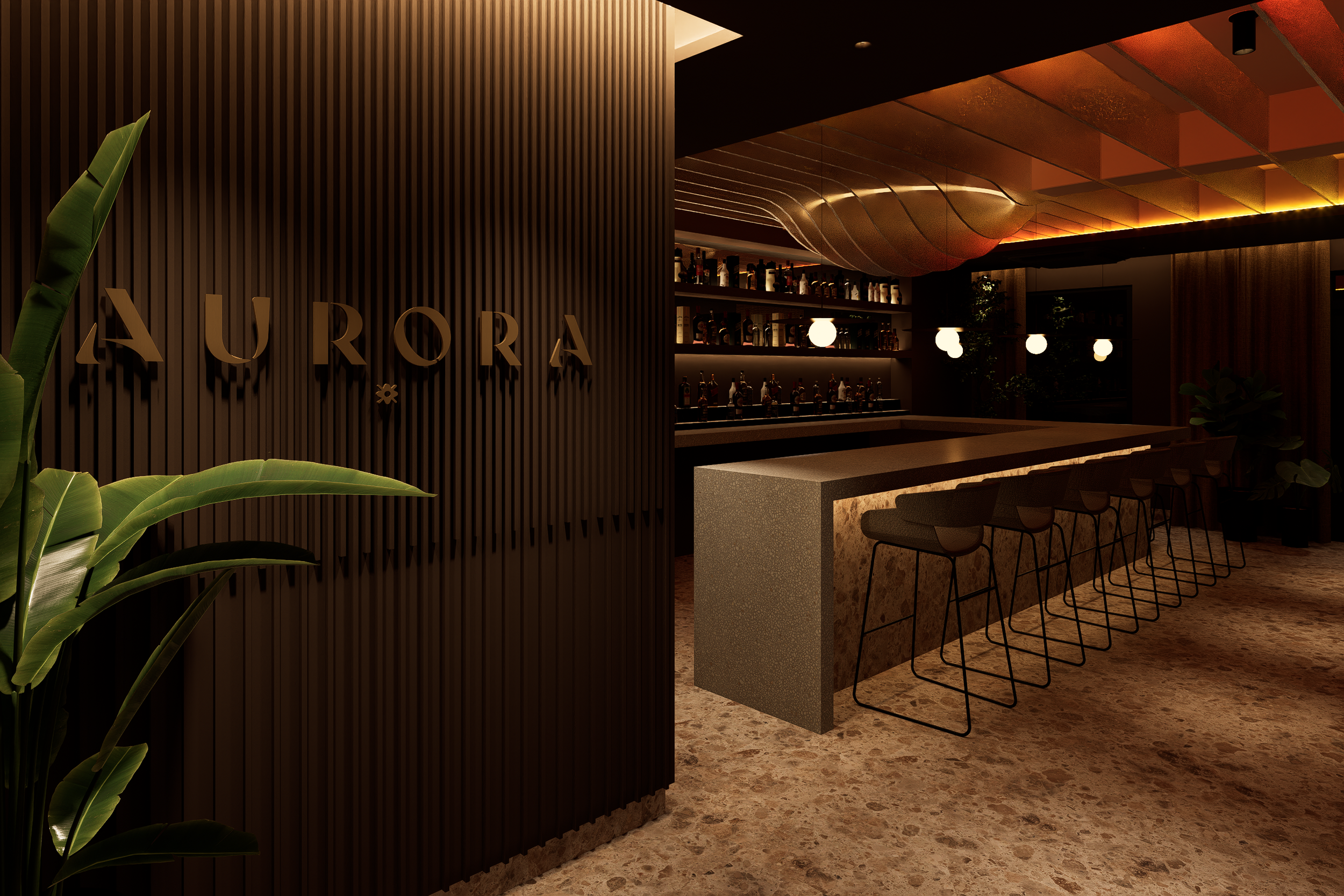 Aurora Bar es un concepto que celebra la transición entre el día y la noche, un espacio que refleja la idea de Aurora como un nuevo comienzo, un renacer constante tanto en su arquitectura como en su atmósfera. Dividido en dos ambientes complementarios, Aurora Bar invita a sumergirse en la belleza de los cambios naturales a través de sus dos zonas diferenciadas: Alborada y Ocaso.
