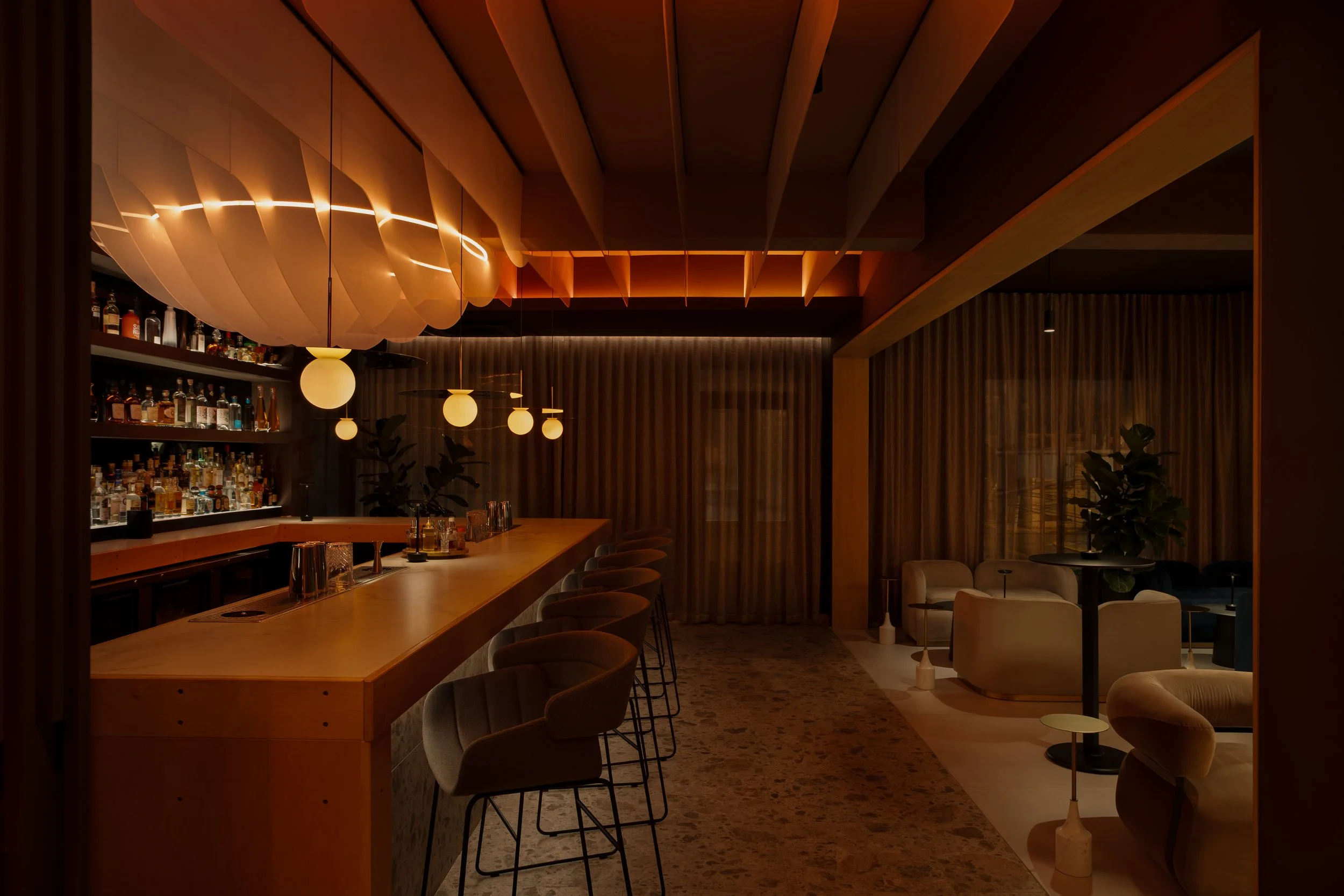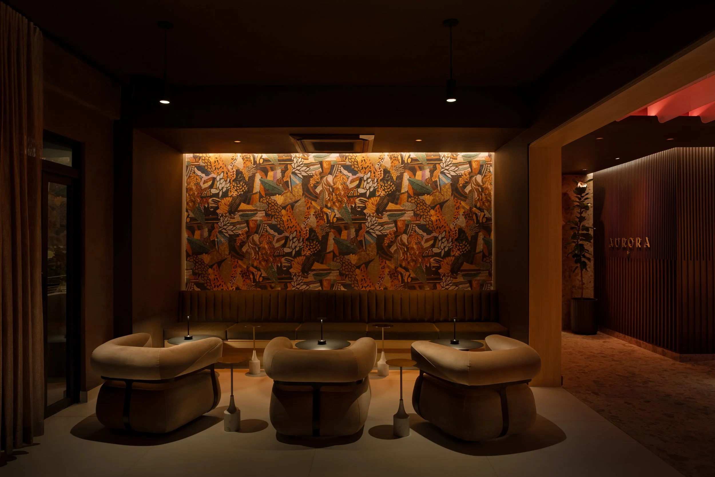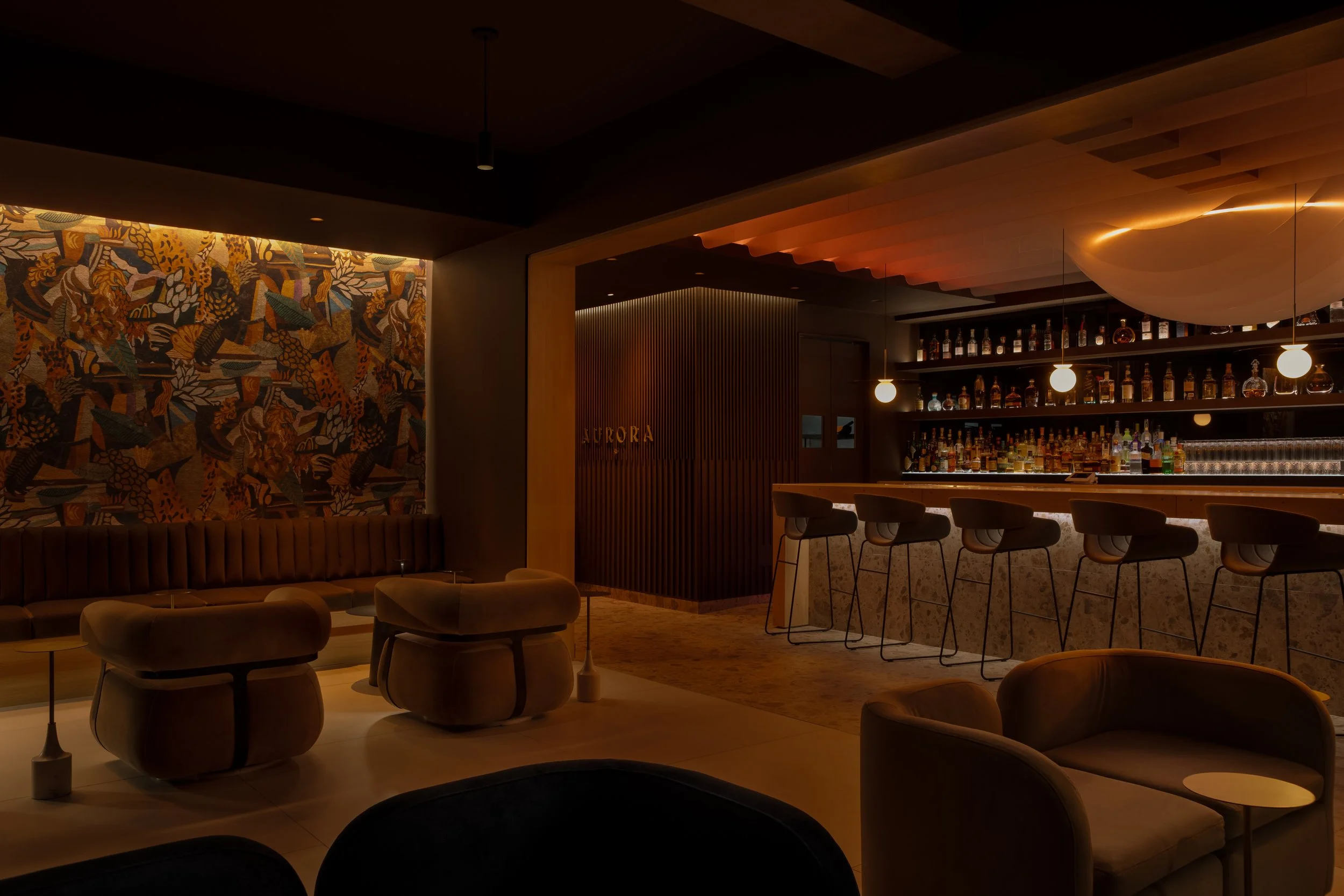 El diseño de Aurora Bar no solo se basa en la estética, sino también en la creación de un recorrido sensorial que acompaña a los visitantes desde el primer al último sorbo de la noche. Ofreciendo un nuevo comienzo tanto en la arquitectura como en la experiencia, cada elemento del espacio está pensado para sumergir a los visitantes en un ambiente de constante transformación y renovación, como el ciclo diario del sol.