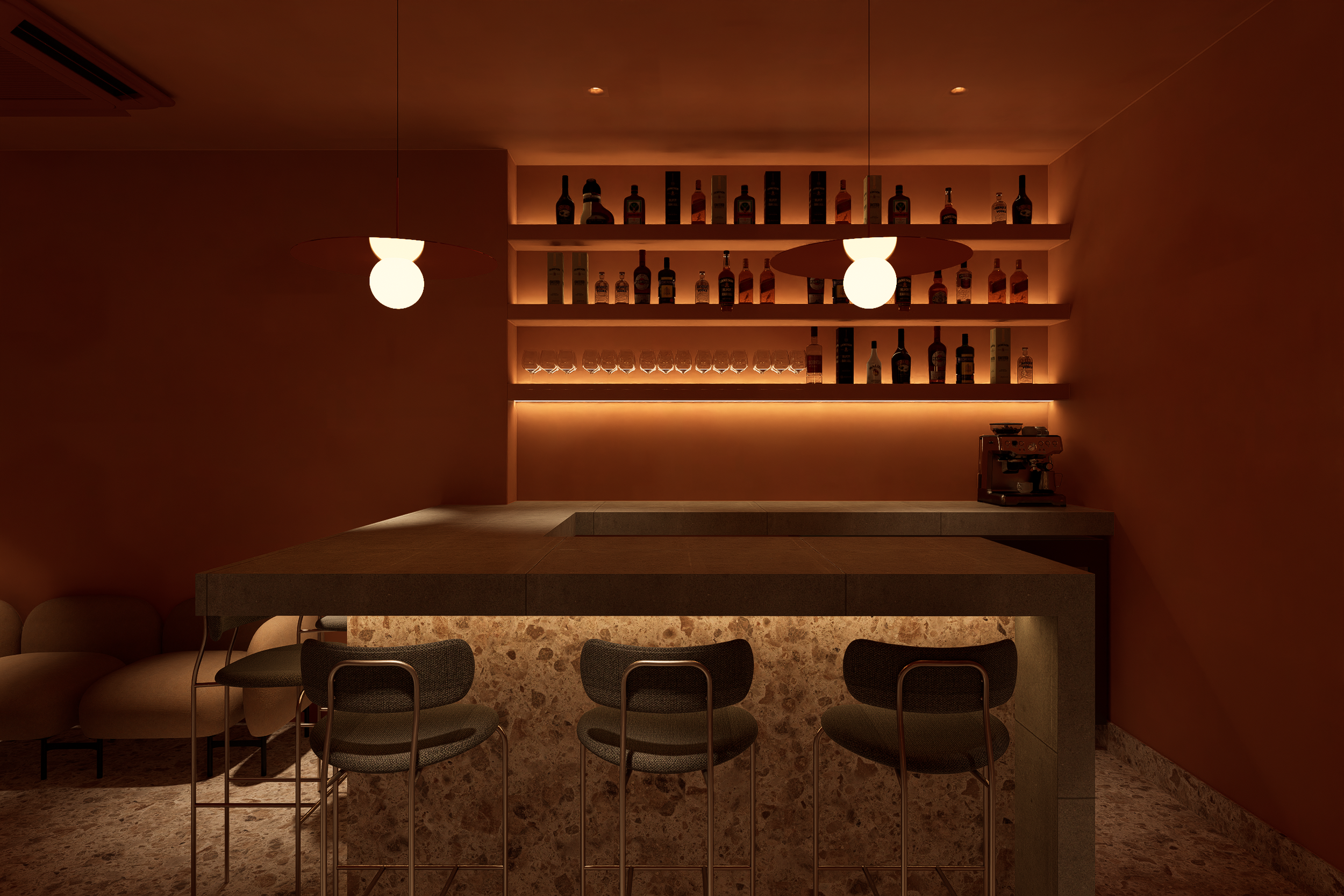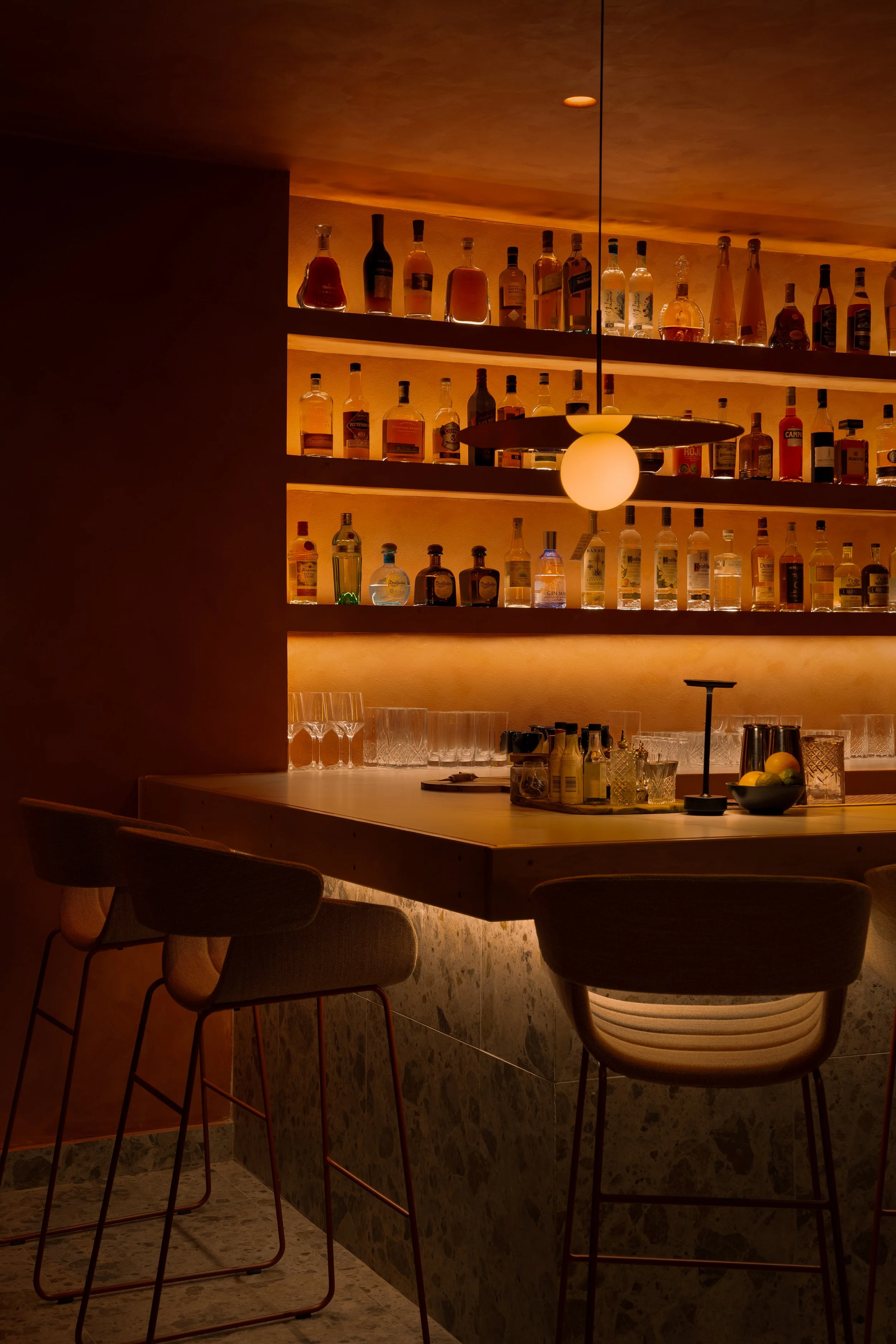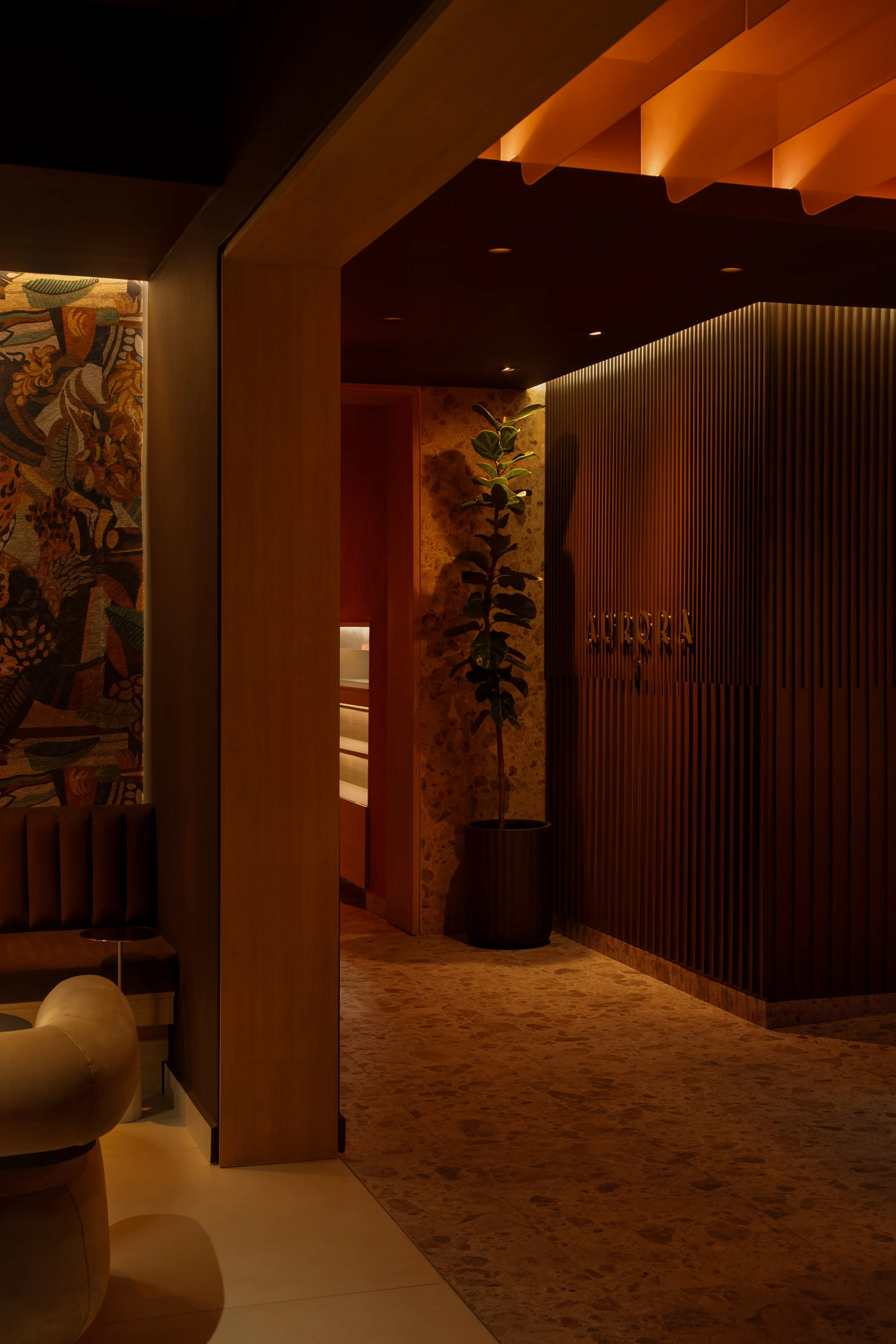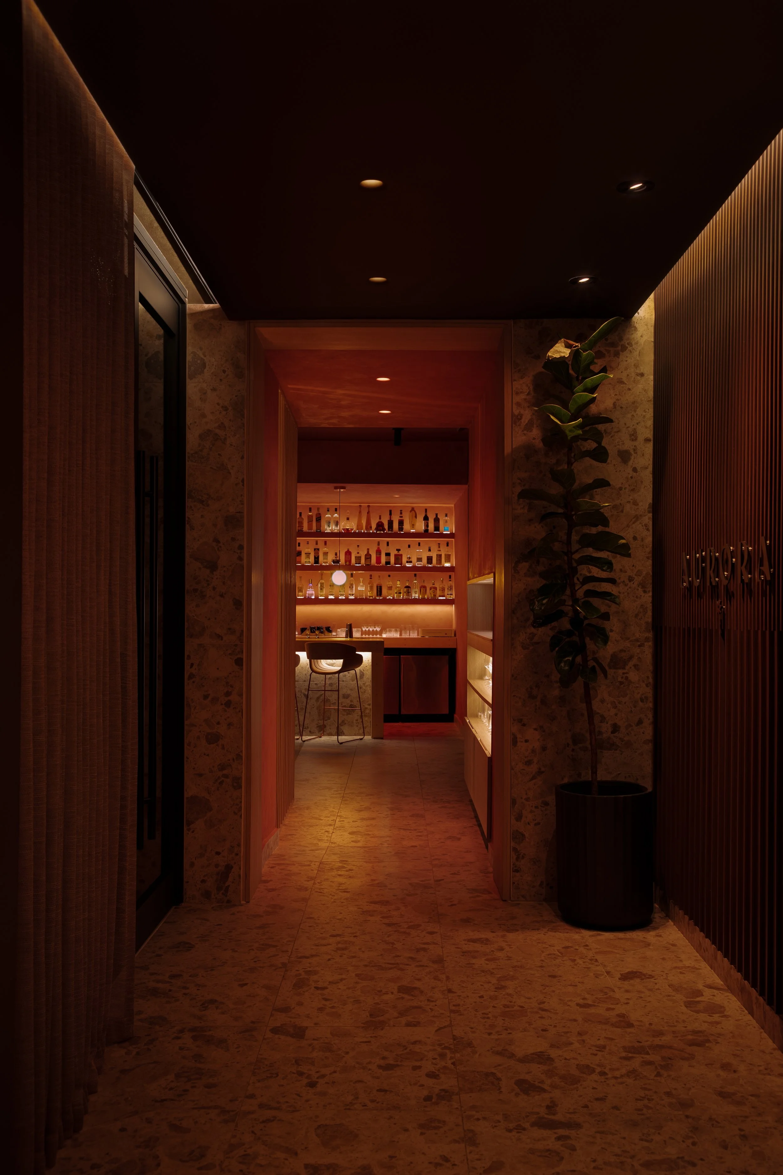 El diseño de Aurora Bar no solo se basa en la estética, sino también en la creación de un recorrido sensorial que acompaña a los visitantes desde el primer al último sorbo de la noche. Ofreciendo un nuevo comienzo tanto en la arquitectura como en la experiencia, cada elemento del espacio está pensado para sumergir a los visitantes en un ambiente de constante transformación y renovación, como el ciclo diario del sol.