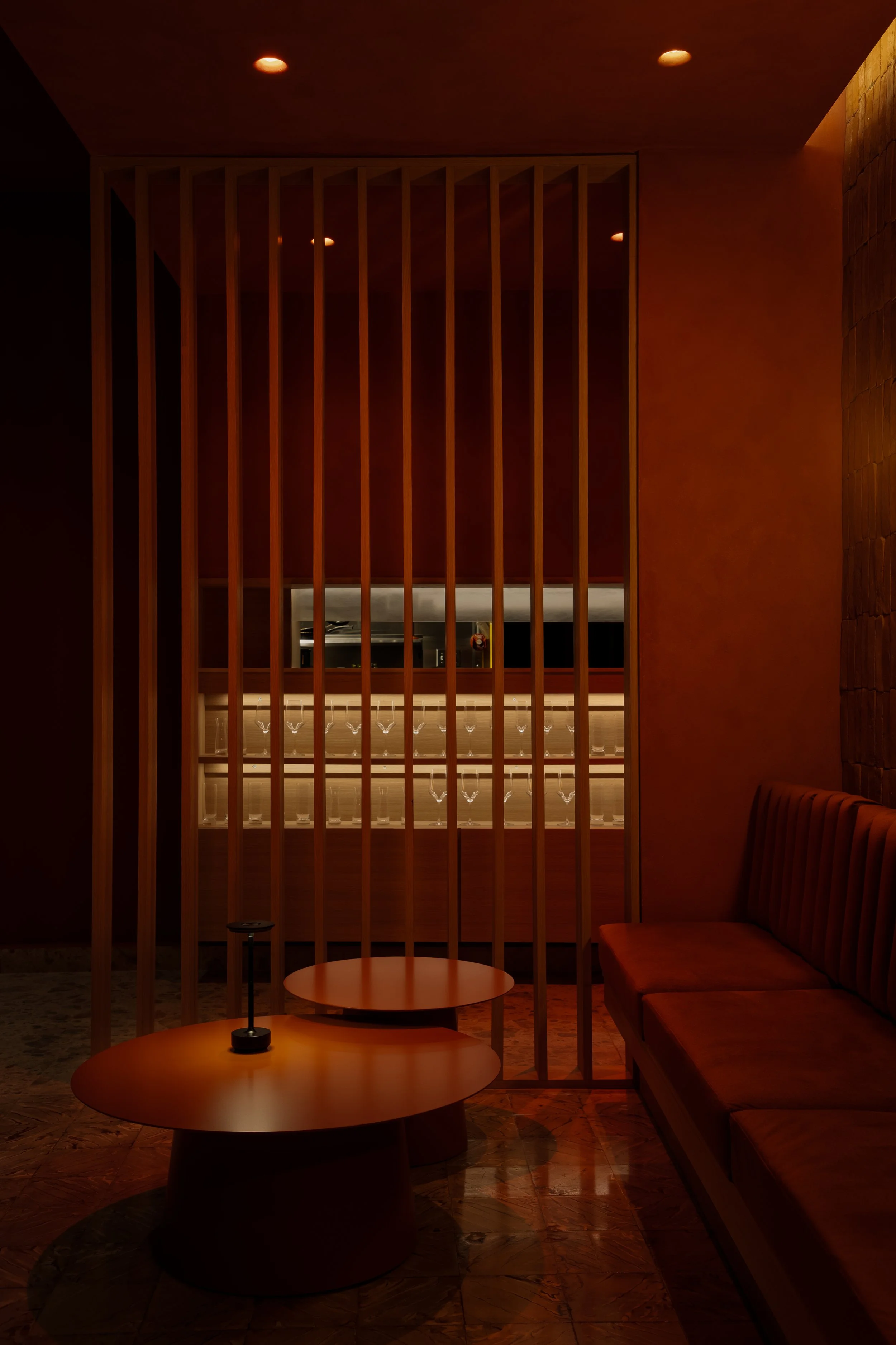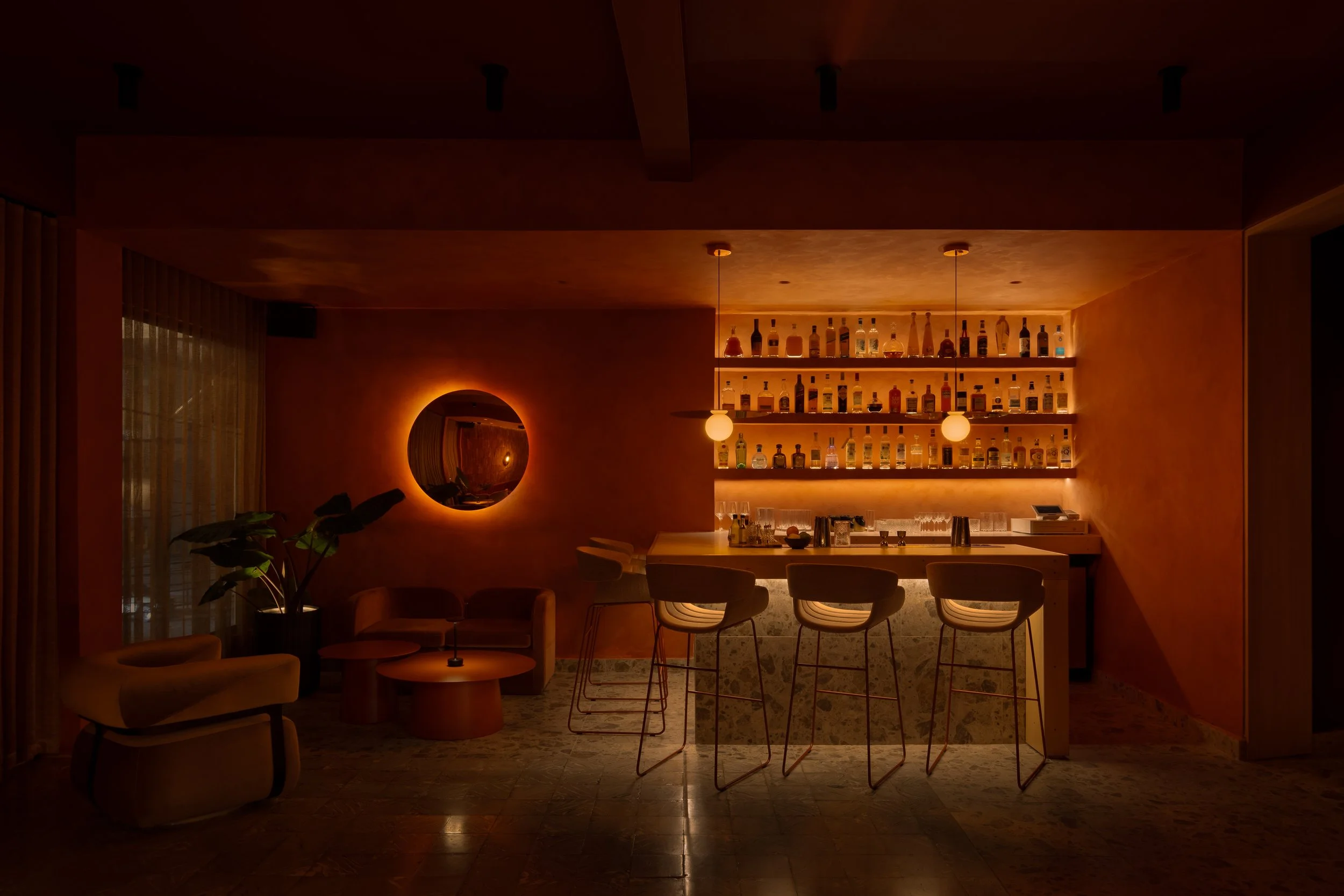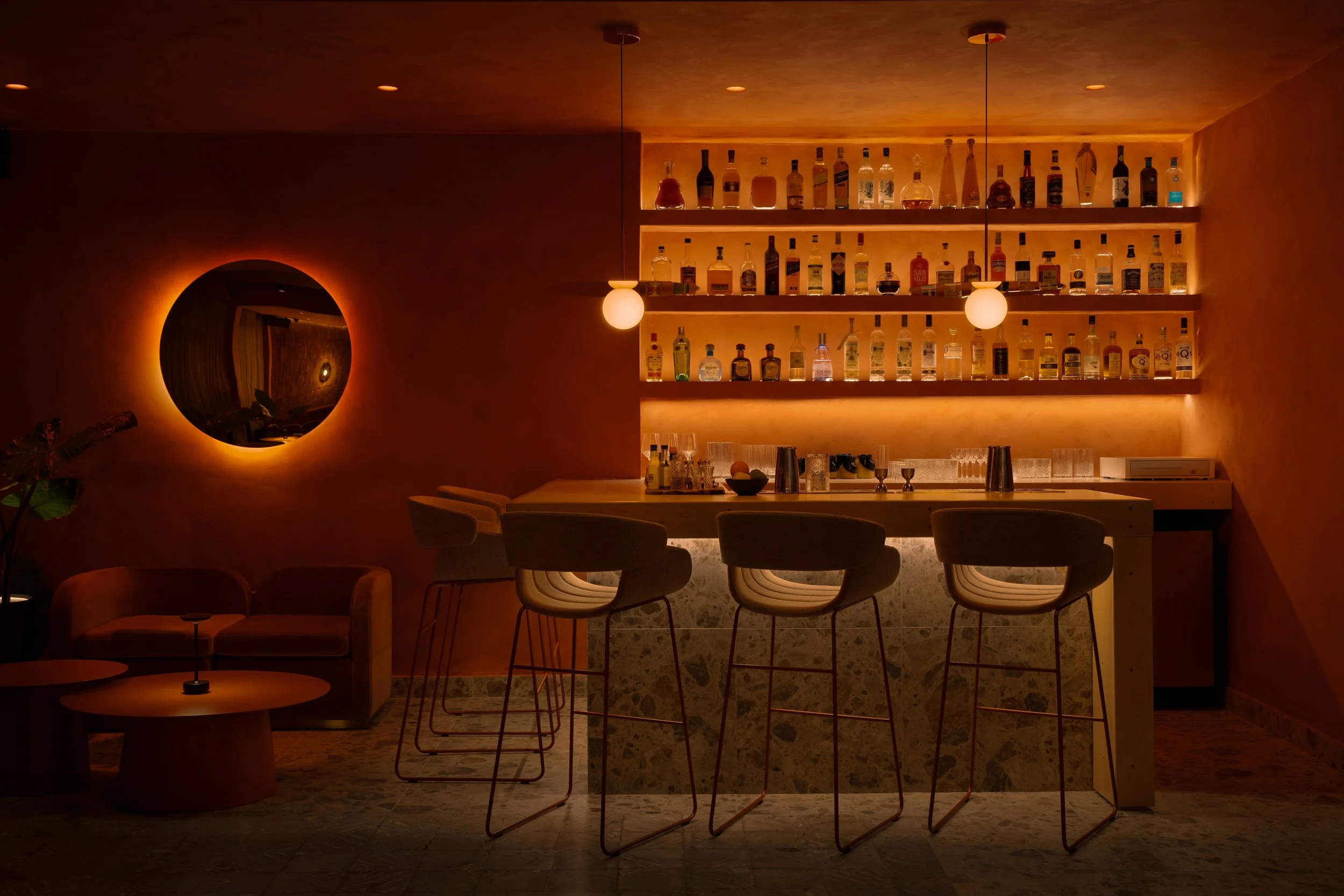 El sol, como protagonista central del diseño, guía el flujo de luz y color en cada rincón, simbolizando la constante renovación y transformación del bar. Este elemento se convierte en clave de la conceptualización del espacio: en la barra principal, una pieza escultórica suspendida representa el sol del amanecer mediante un aro que cambia sus tonalidades a lo largo de la noche, convirtiéndose en el corazón del espacio. Mientras tanto, en Ocaso, el sol se representa a través de un espejo circular que, al igual que el sol al atardecer, refleja y difunde la luz de manera suave y cálida, evocando el fin del día. Además, el sol cobra vida en diversos momentos del proyecto, desde la luminaria cilíndrica hasta las superficies circulares, estableciendo un vínculo visual entre los distintos elementos del diseño.