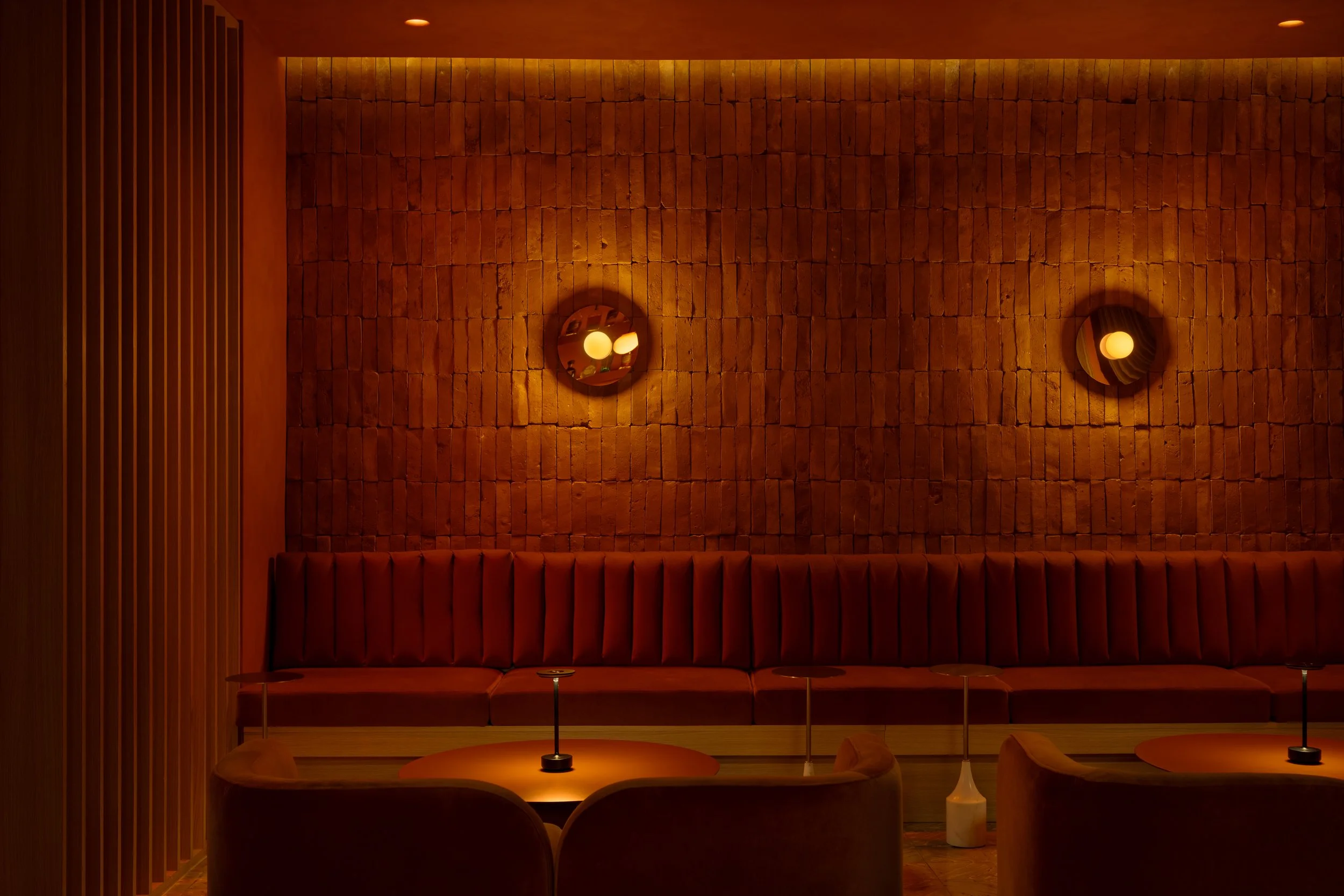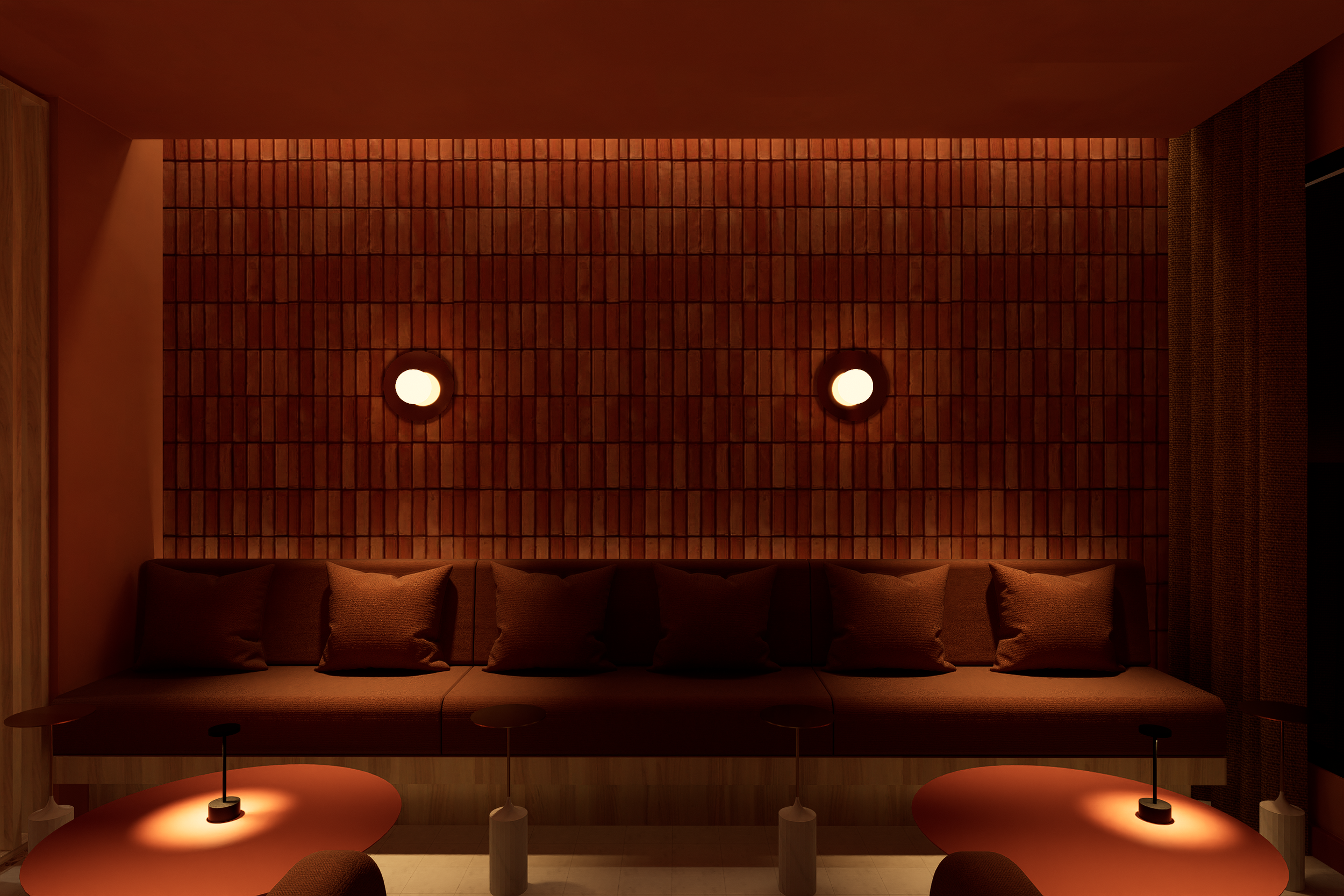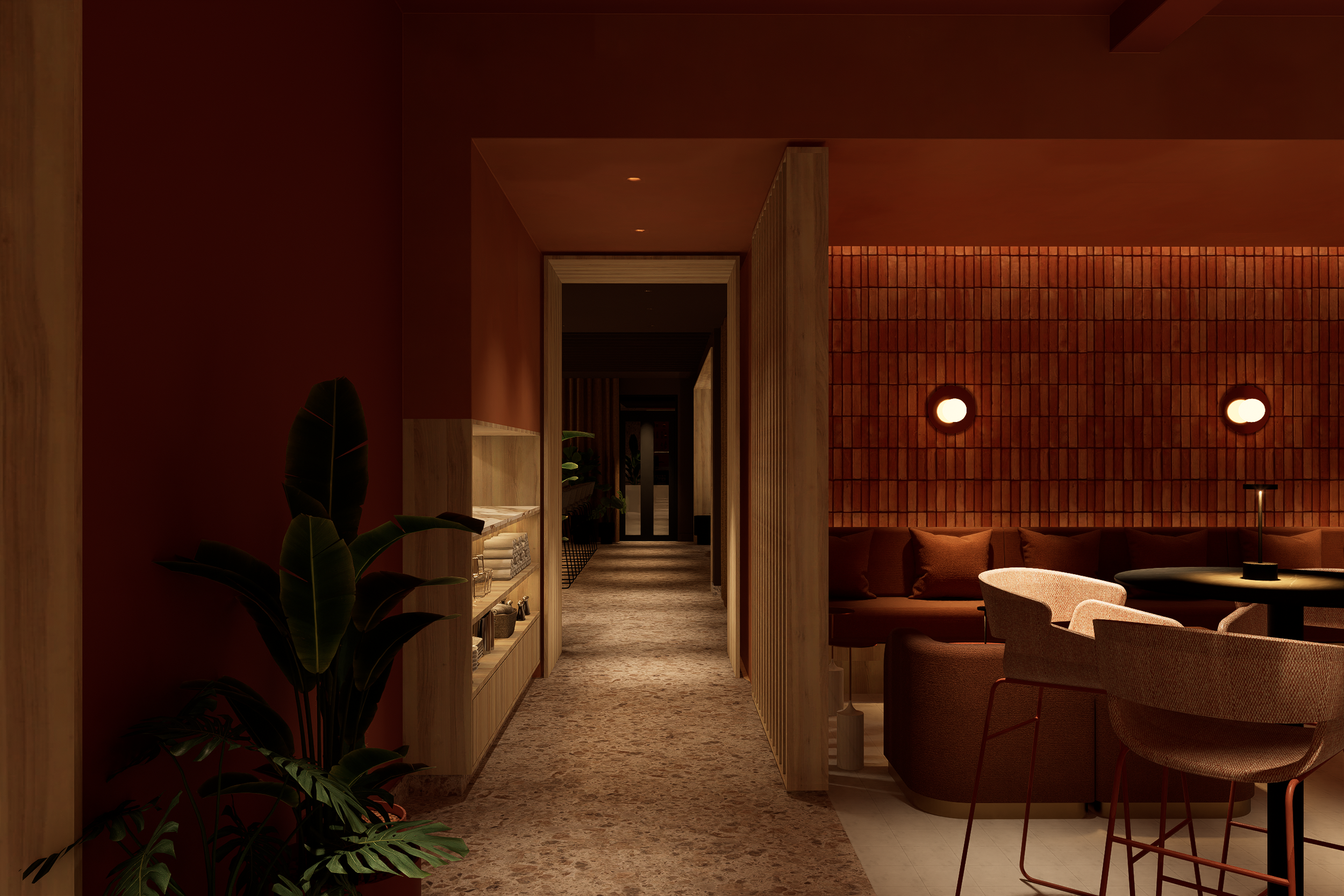 En el lado de Ocaso, el diseño se inspira en la calma y el misterio de la puesta del sol. Los tonos terracota y cálidos dominan este espacio, imitando los colores del horizonte al caer la noche, y creando una atmósfera acogedora y envolvente que invita a la relajación. Para materializar el concepto del atardecer, se utilizó ladrillo real en las paredes, evocando la tierra y su conexión con el ciclo natural del día. Las superficies de telas, metales y limewash terracotta, enriquecen el espacio con texturas que recuerdan el atardecer. En este lado, la madera de roble blanco también se incorpora sutilmente, proporcionando una base neutral que suaviza las tonalidades más cálidas, manteniendo la sensación de conexión con la naturaleza mientras resalta la riqueza del espacio.