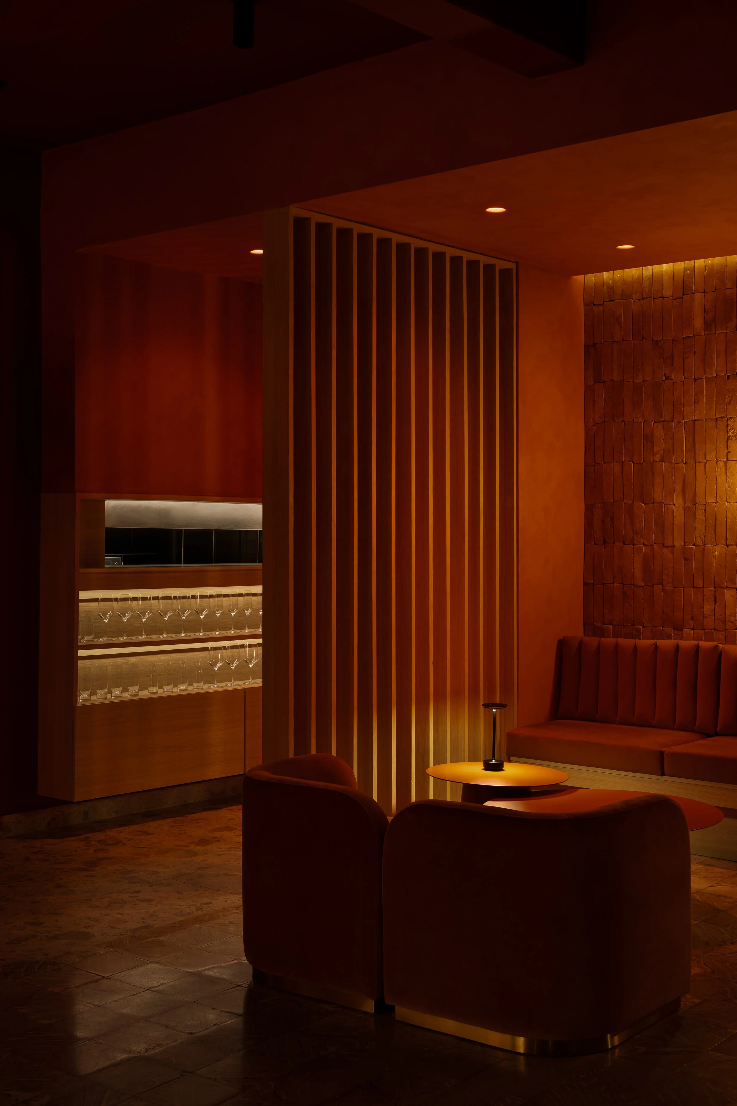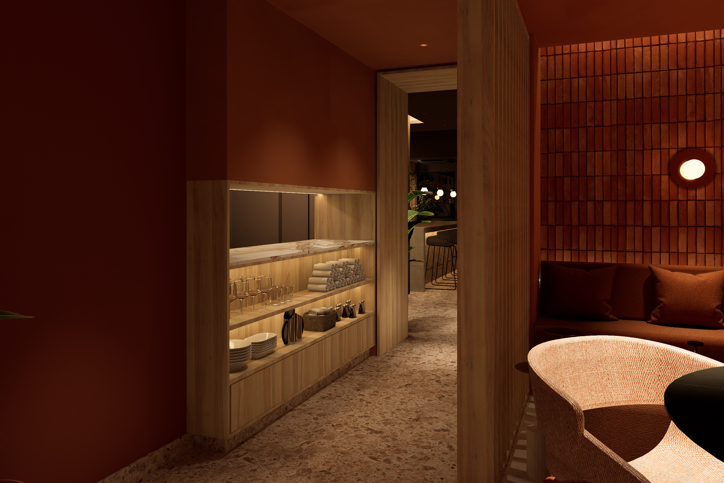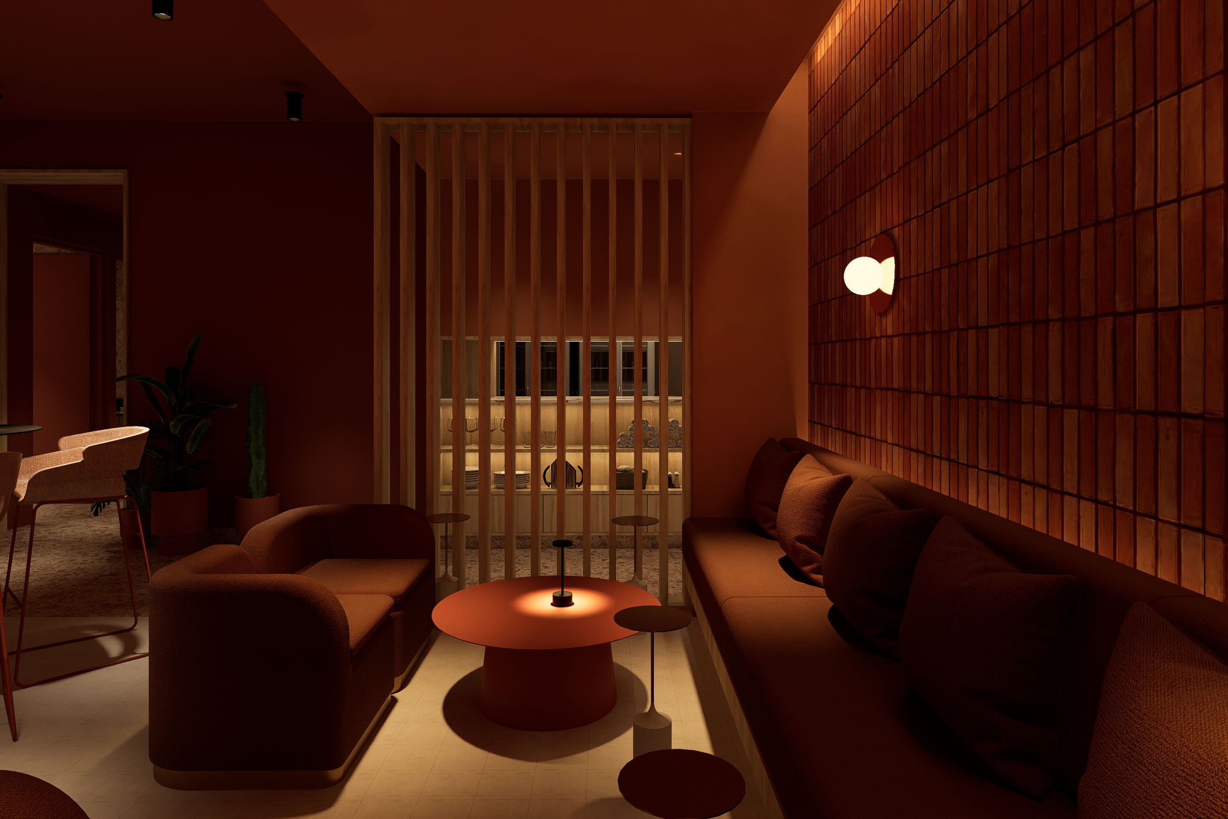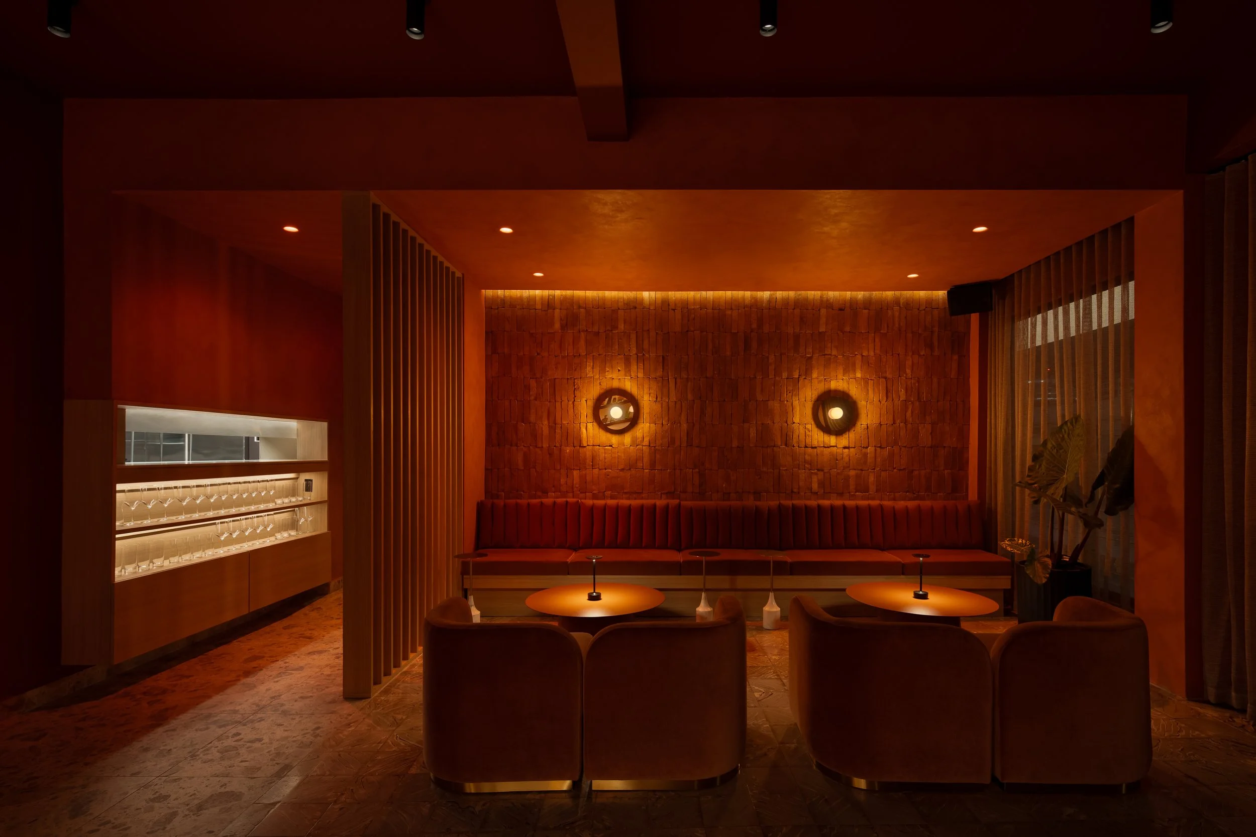 En el lado de Ocaso, el diseño se inspira en la calma y el misterio de la puesta del sol. Los tonos terracota y cálidos dominan este espacio, imitando los colores del horizonte al caer la noche, y creando una atmósfera acogedora y envolvente que invita a la relajación. Para materializar el concepto del atardecer, se utilizó ladrillo real en las paredes, evocando la tierra y su conexión con el ciclo natural del día. Las superficies de telas, metales y limewash terracotta, enriquecen el espacio con texturas que recuerdan el atardecer. En este lado, la madera de roble blanco también se incorpora sutilmente, proporcionando una base neutral que suaviza las tonalidades más cálidas, manteniendo la sensación de conexión con la naturaleza mientras resalta la riqueza del espacio.