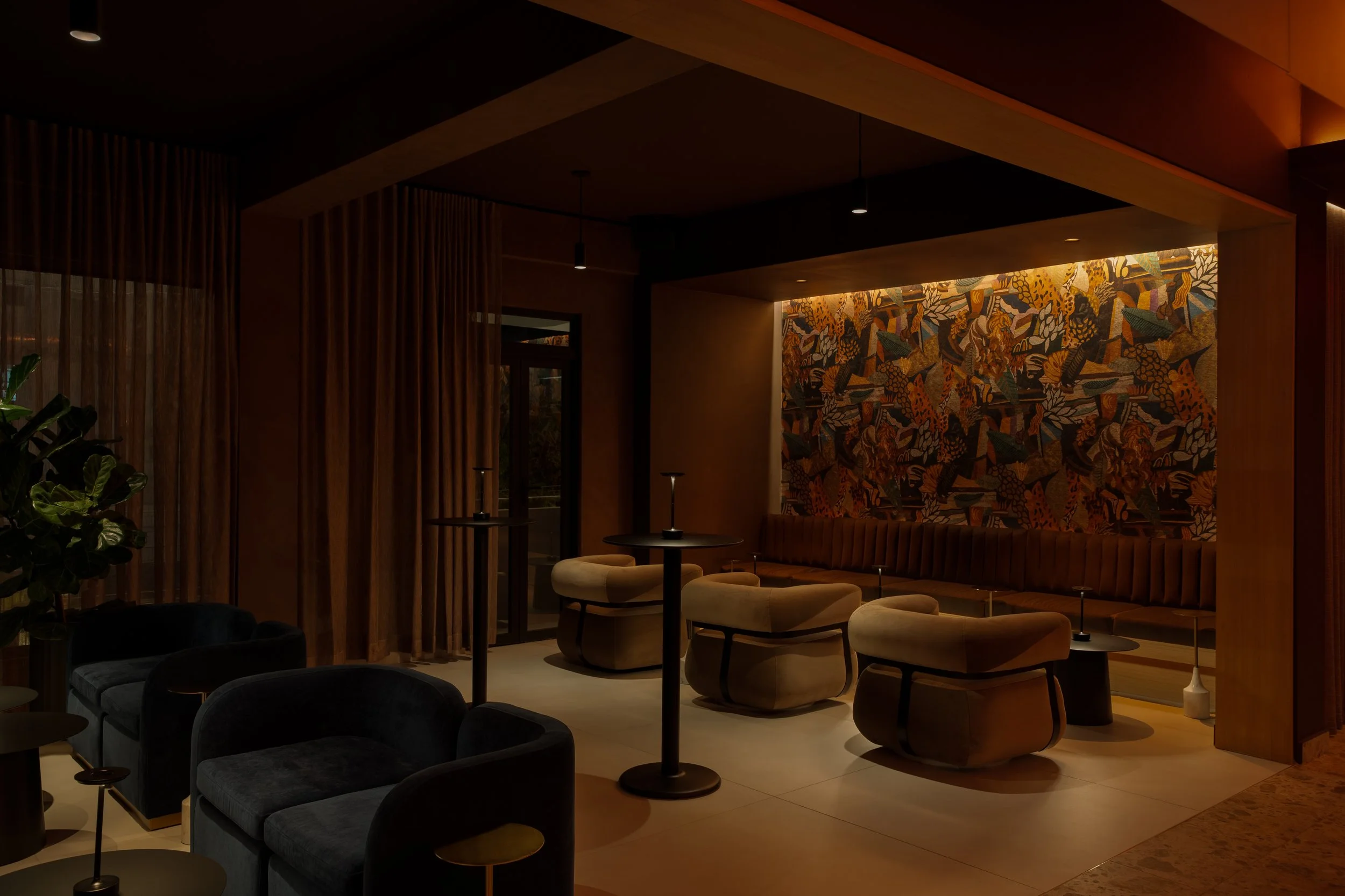 El lado Alborada evoca la frescura del amanecer, con tonalidades cálidas de marrón y naranja que capturan la luz suave y delicada de los primeros rayos del día. Este espacio está diseñado para transmitir la serenidad de los comienzos, con elementos naturales y texturas suaves que invitan a la reflexión y la tranquilidad. Se incorporaron, además, subtonos azules y verdes, que remiten al contraste entre el mar y la exuberante vegetación tropical, evocando la riqueza natural de la isla. El ambiente se completa con un wallpaper de naturaleza abstracta que da una sensación de dinamismo y organicidad. Las telas de tonos azul marino y marrón, junto con un limewash marrón oscuro en las paredes, crean una atmósfera acogedora, rica en texturas y cálida. La madera de roble blanco, utilizada en detalles arquitectónicos, añade un toque natural y neutral que equilibra las tonalidades más intensas, creando una sensación de ligereza y armonía que conecta con la esencia de la isla.