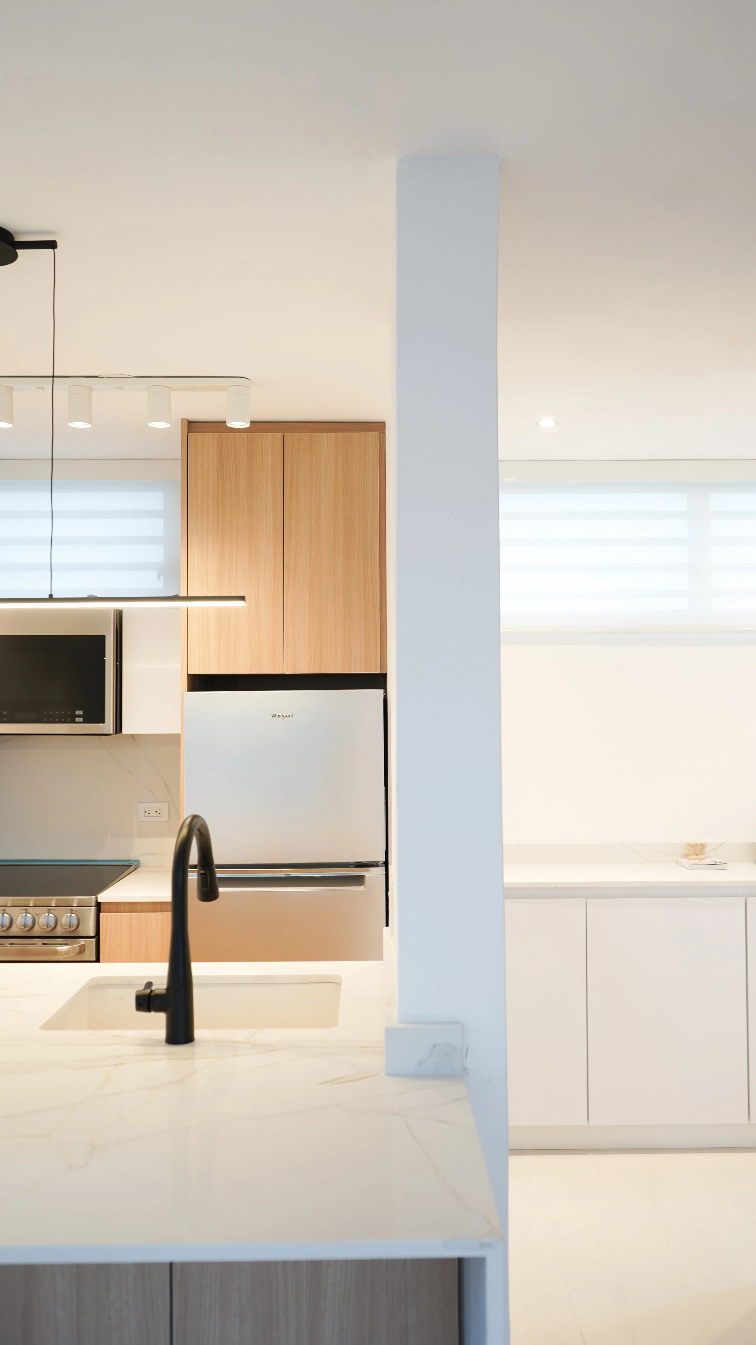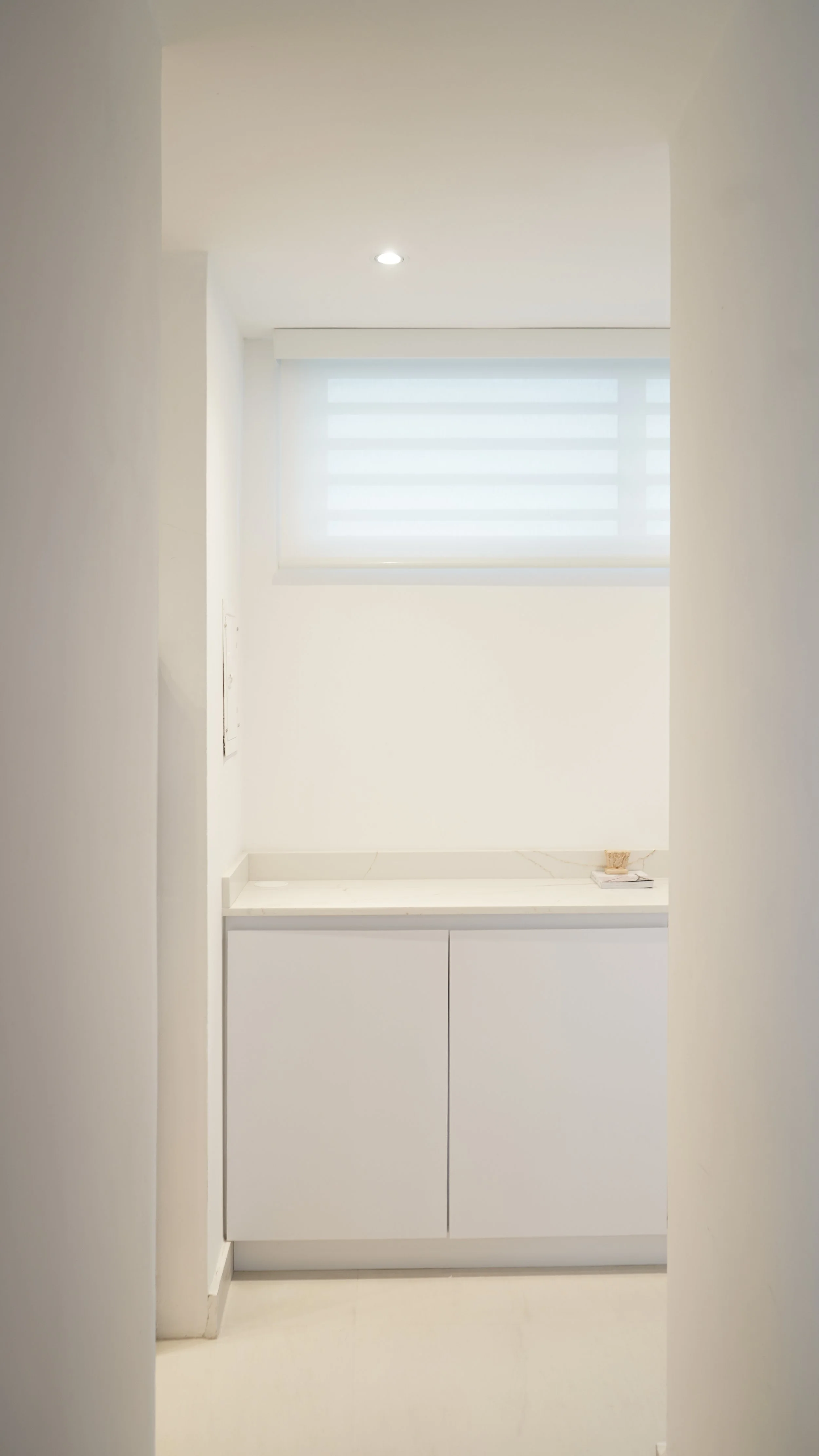 The finishes in this renovation feature a neutral color palette, with walls painted in crisp white. The kitchen showcases white matte/white oak finishes, providing a clean and contemporary look. The countertops are made of beautiful white quartz with caramel veins, ensuring both aesthetics and durability.