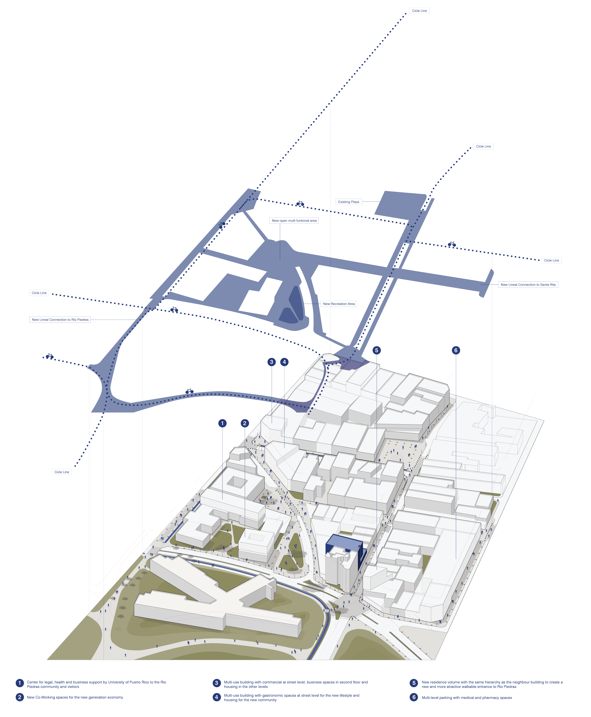 "Old New Rio" is a proposal that aims to revitalize Rio Piedras, which was once the most significant cultural center of the Caribbean. In the past, the University of Puerto Rico and the urban area of Rio Piedras shared a mutual dependence based on cultural and economic aspects. However, in the present, this relationship no longer exists. This proposal seeks to bridge the gap between both communities by promoting densification through the introduction of new commercial and co-working spaces, housing options, and open green spaces for public enjoyment.