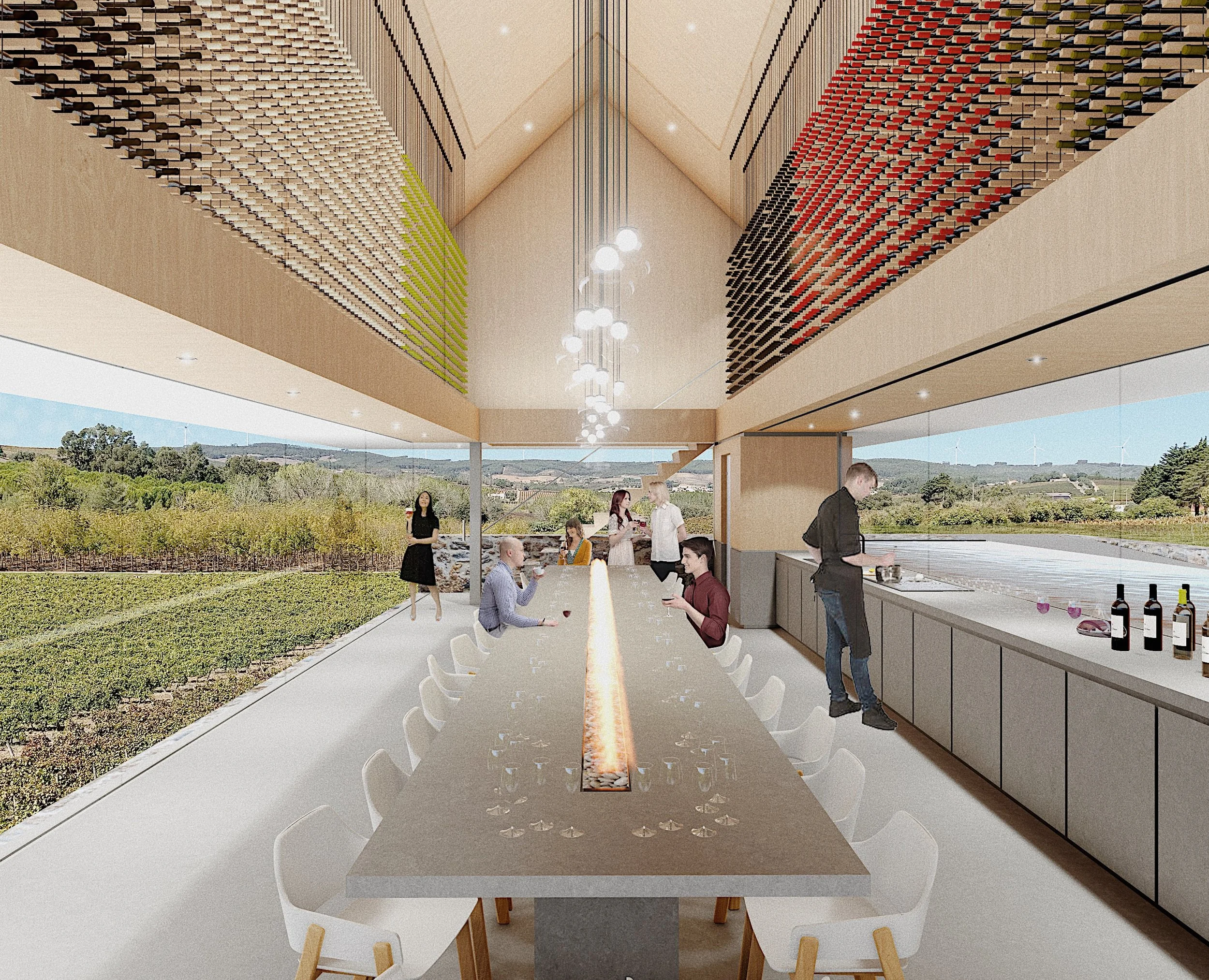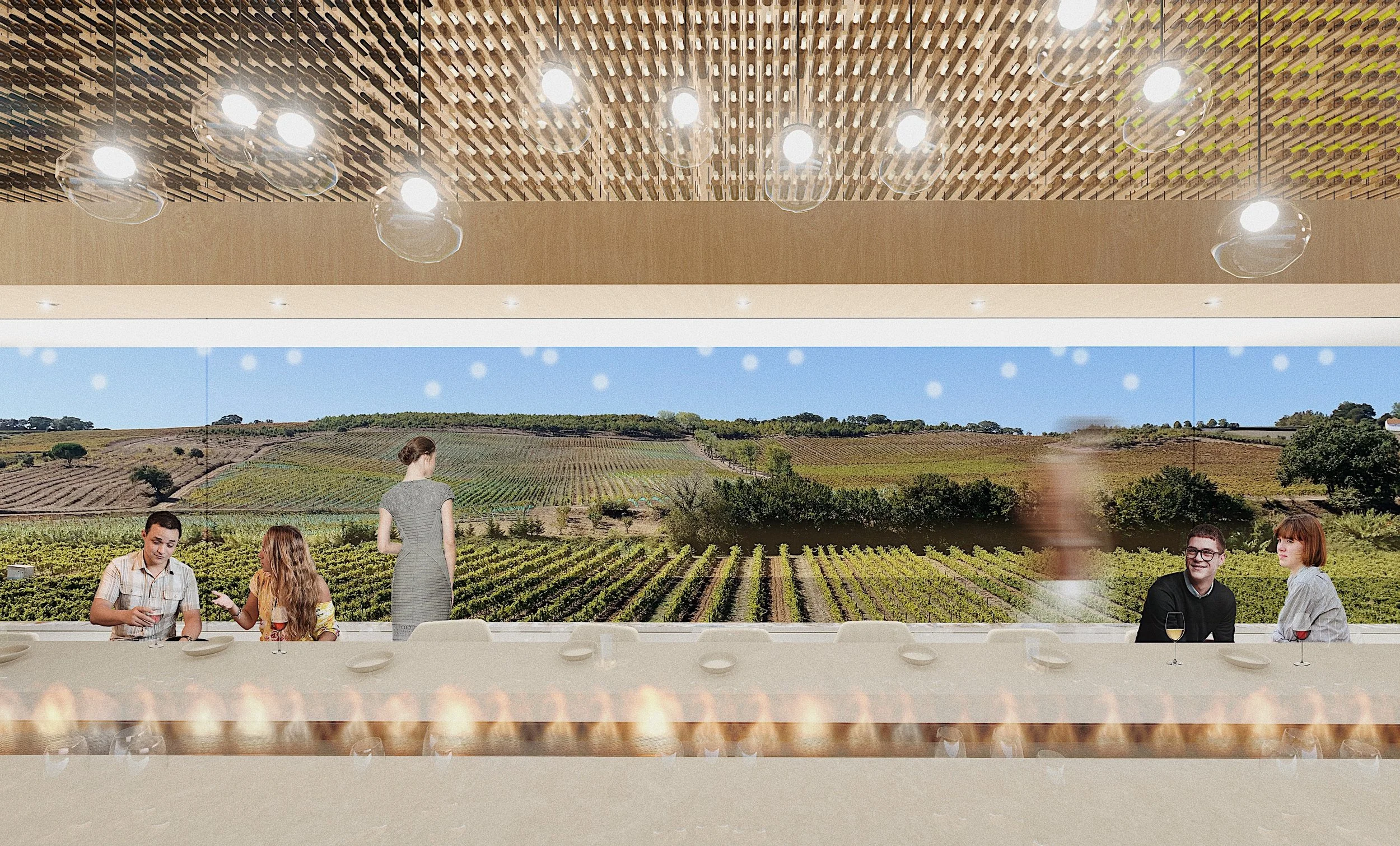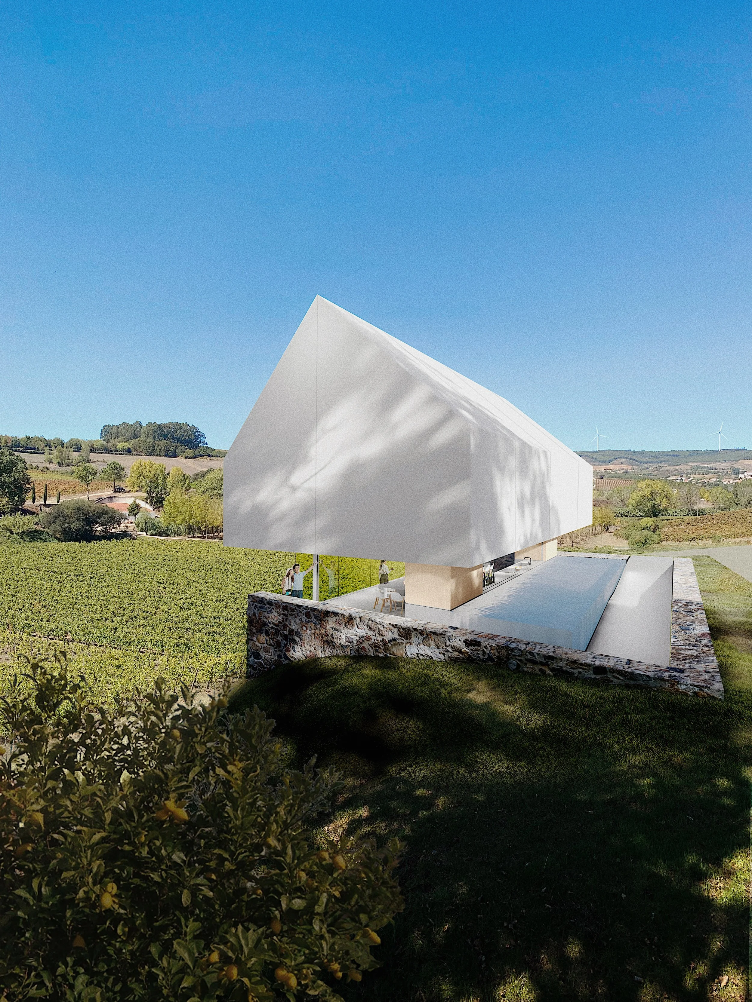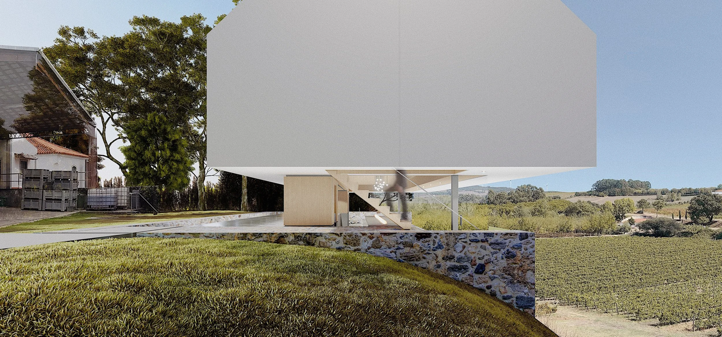 From below, a stony submerged platform will become the base for the emerging space; the same way soil becomes the foundation for seed germination. Within it, a pond representing the element of water. The plant foliage takes shape as a suspended object over its stem, and this will evolve as a symbol of the "farming to wine" transformation. First, the floating shape will become a representation of a wooden barrel containing grapes in its fermentation process. Then, the volume takes the shape of a Portuguese typical vineyard architecture to store and start the wine aging process. The final "house" shape will veil on white to reveal the duality between the typical vinery structure and the contemporary minimal Portuguese architecture. Visitors will immerse themselves into a sensorial experience by submerging below the ground level through a ramp that directs them into a panoramic wine tasting room. Inside, "Gout de Terroir" main elements will be present: rock, water, air, and above, the floating element that reminds of the treetop. The suspended space will be home to thousands of ready-to-tasting wines, controlled temperature, and no sun exposure. A long storage, bathroom, and kitchen core serves to a minimal table where 30 visitors can enjoy their wine tasting experience while contemplating the breathtaking vineyard field views. This proposal embodies the wine process, from the growing environment to the tasting table.
