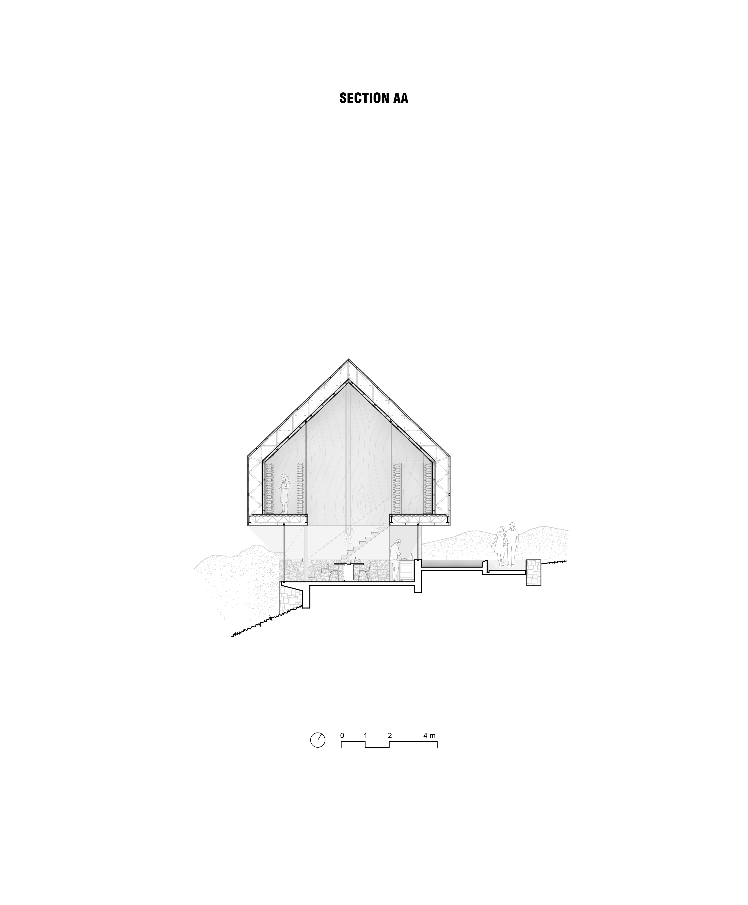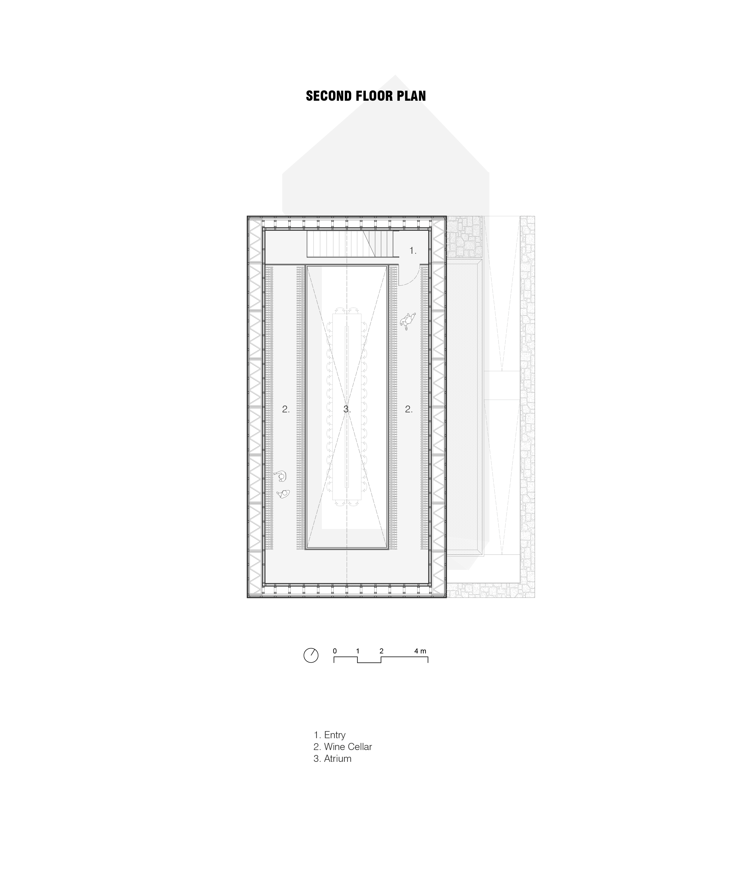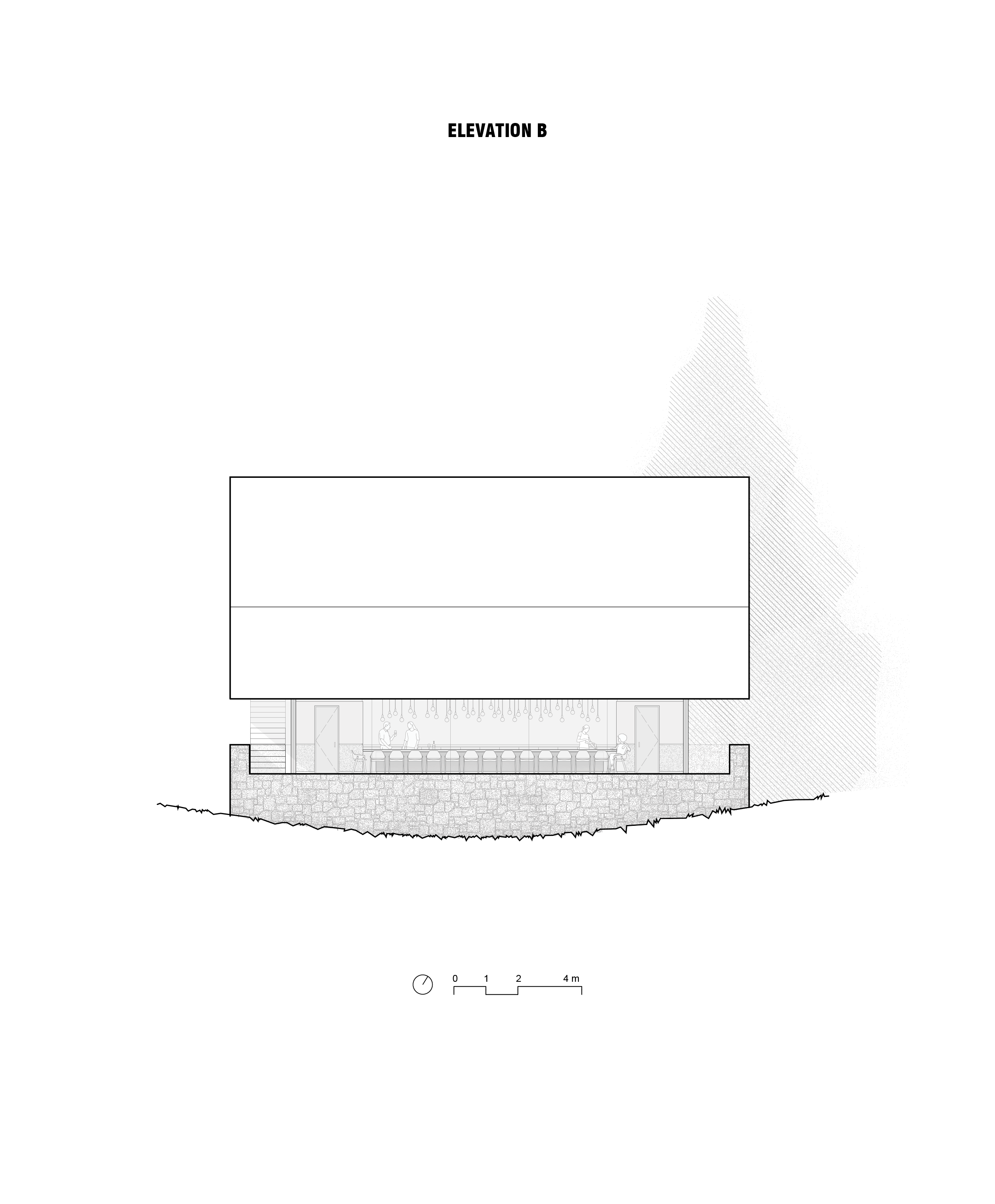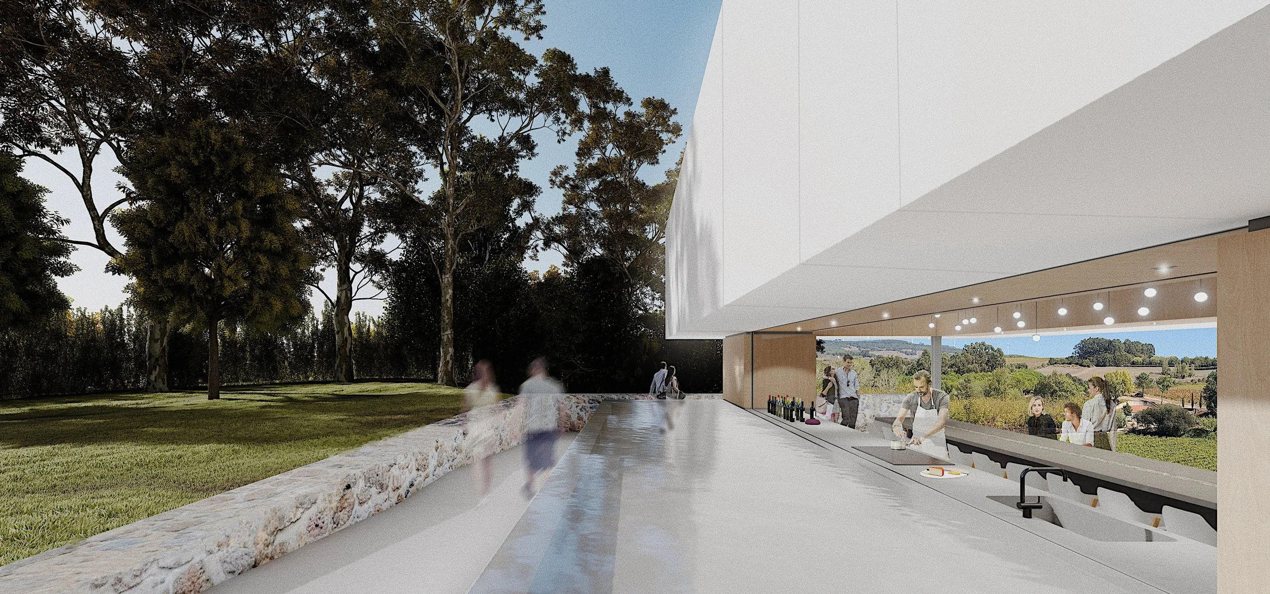 From below, a stony submerged platform will become the base for the emerging space; the same way soil becomes the foundation for seed germination. Within it, a pond representing the element of water. The plant foliage takes shape as a suspended object over its stem, and this will evolve as a symbol of the "farming to wine" transformation. First, the floating shape will become a representation of a wooden barrel containing grapes in its fermentation process. Then, the volume takes the shape of a Portuguese typical vineyard architecture to store and start the wine aging process. The final "house" shape will veil on white to reveal the duality between the typical vinery structure and the contemporary minimal Portuguese architecture. Visitors will immerse themselves into a sensorial experience by submerging below the ground level through a ramp that directs them into a panoramic wine tasting room. Inside, "Gout de Terroir" main elements will be present: rock, water, air, and above, the floating element that reminds of the treetop. The suspended space will be home to thousands of ready-to-tasting wines, controlled temperature, and no sun exposure. A long storage, bathroom, and kitchen core serves to a minimal table where 30 visitors can enjoy their wine tasting experience while contemplating the breathtaking vineyard field views. This proposal embodies the wine process, from the growing environment to the tasting table.