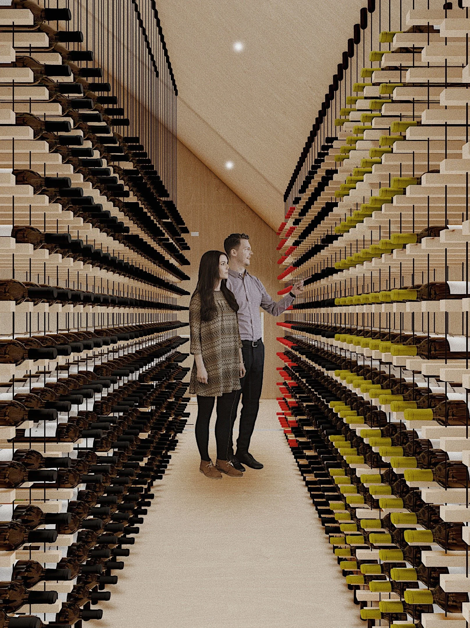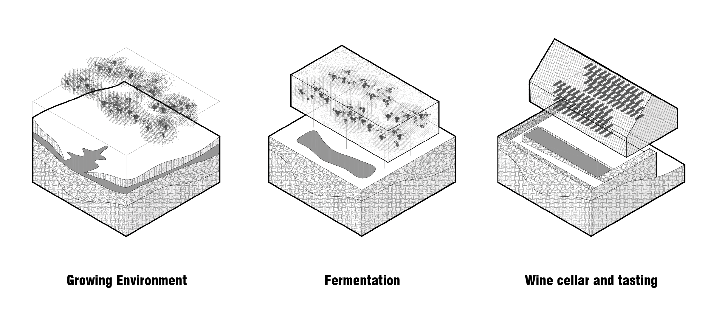What if we embody the wine process, from farming to tasting, into architecture? Wine tasting is the culmination of a delicate and extensive process, which we summarized into three main steps: cultivation, fermentation, and aging. The French phrase "Gout de Terroir" defines the perfect environmental conditions in which grapes are grown, such as soil and climate, giving the wine its unique flavor and aroma. To achieve these perfect planting conditions, stony soil, controlled watering, mild weather, proper sun exposure, and ventilation are essential. These elements will bring to life a plant in which anatomy creates the perfect environment for the fruit's growth. Its stem suspend the foliage from the ground drawing shadow to the grapes that will later transform into wine. These layering elements will bring to life our proposal the same way they do to wine.