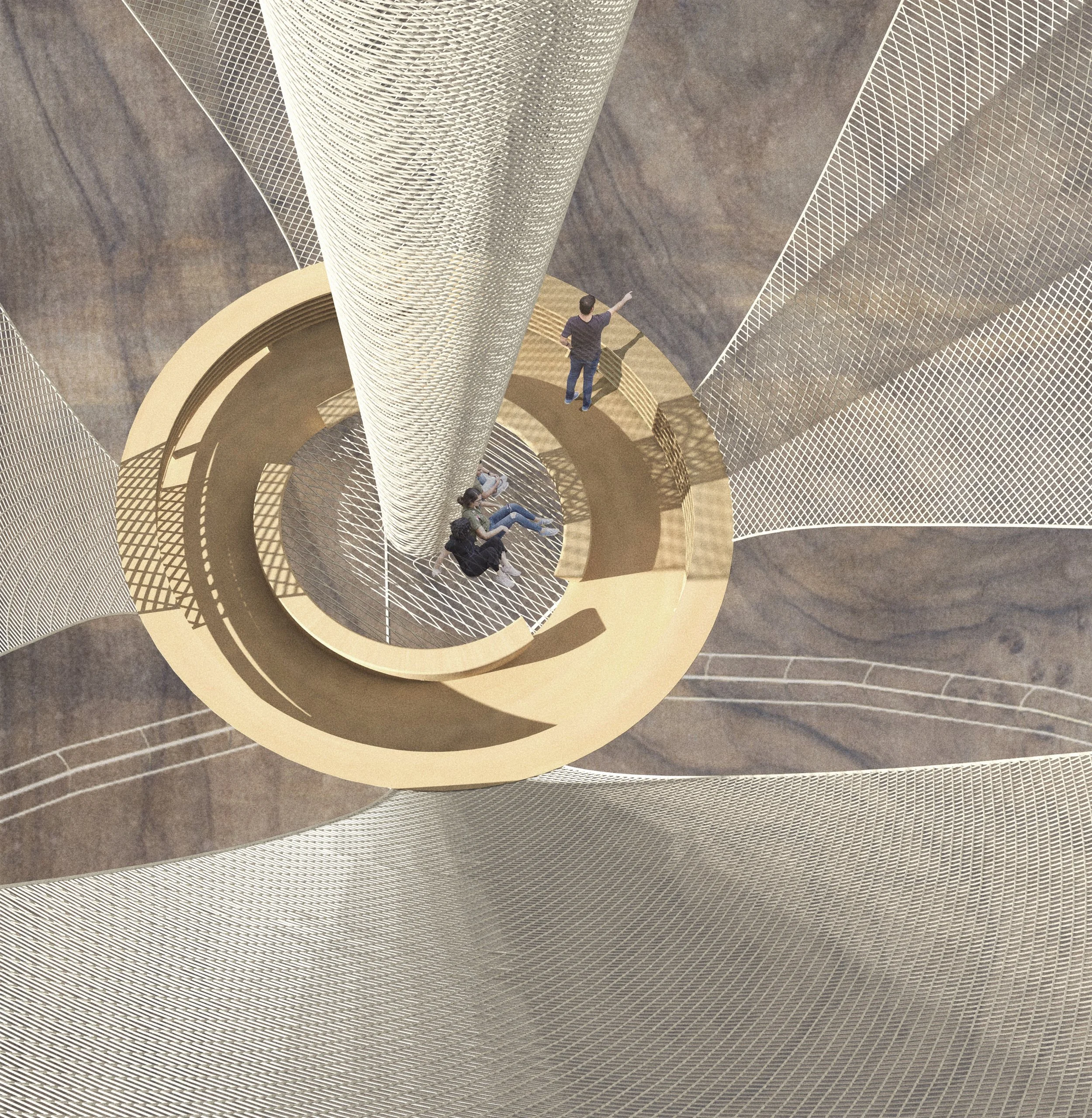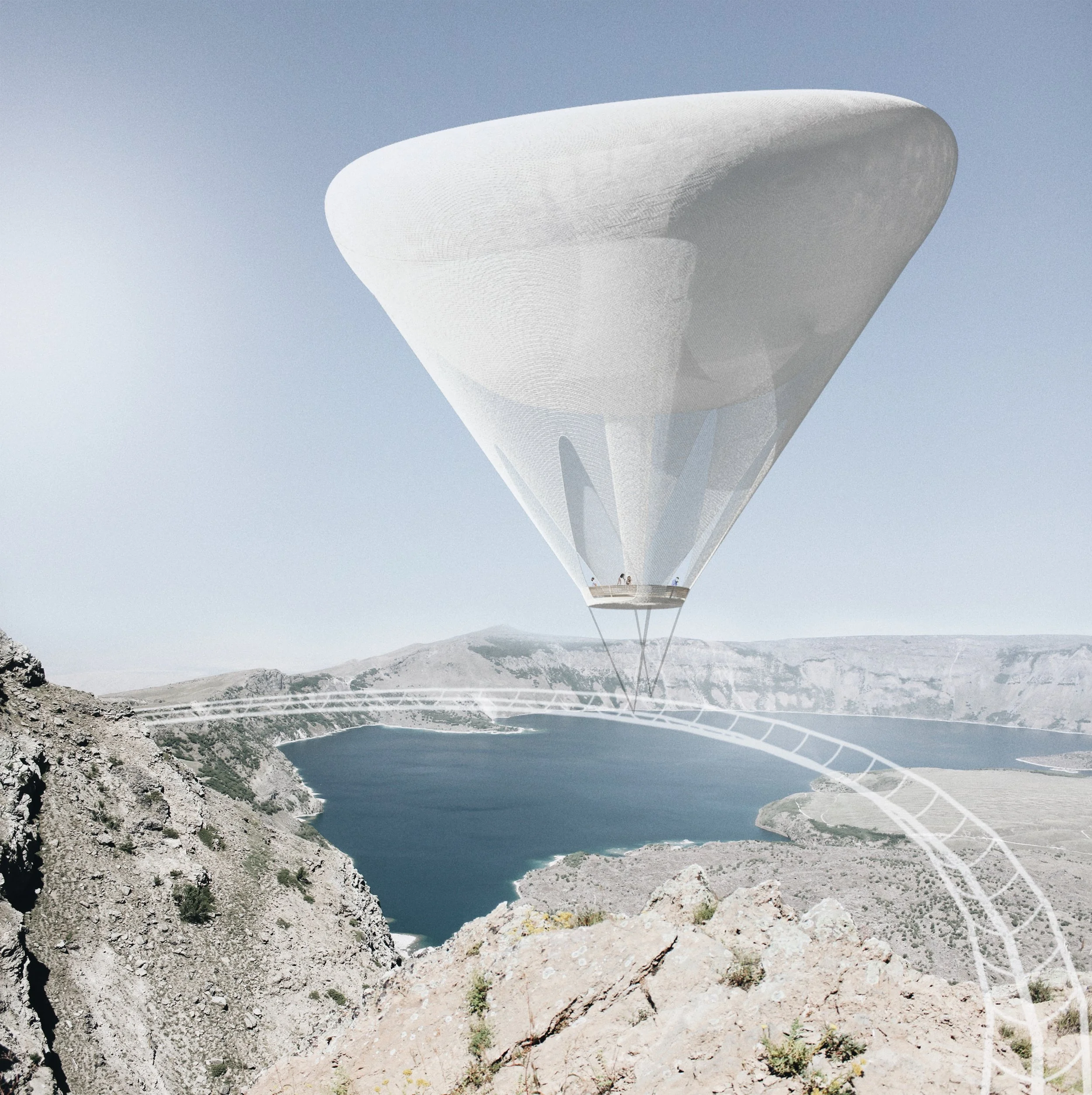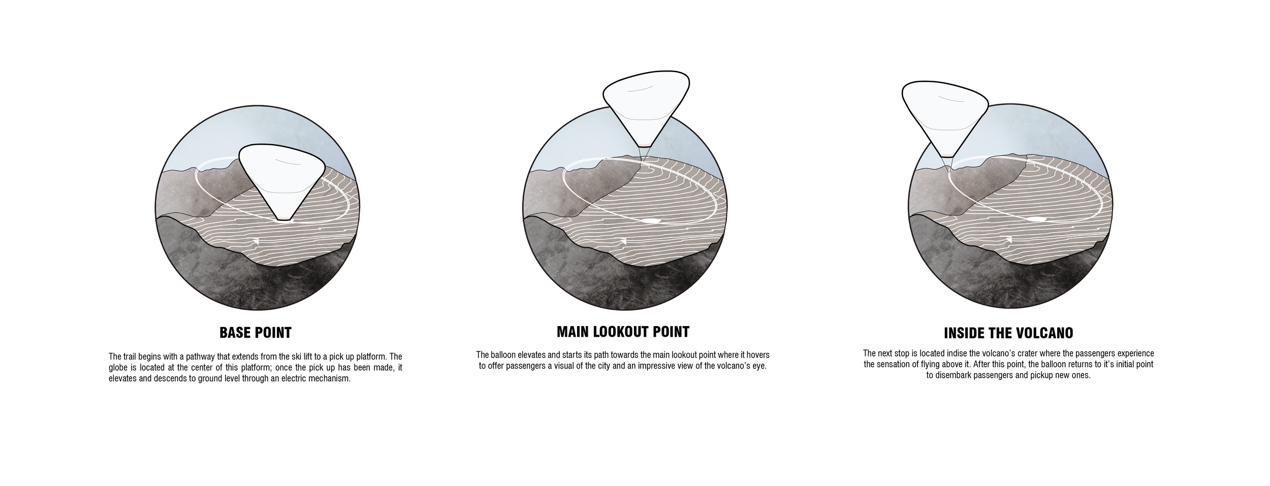 What if we were to change the idea of a static observatory reached by an independent trail to a moving union of these components? In order to do this, we took the predetermined program area for the observatory platform and conceded it to the air balloon platform. We then, placed the platform on top of a rail that controls its trajectory. This control rail is ecofriendly, thanks to its specified anchor points that has a minimum ground impact. The helium balloon achieves an easy assembly and disassembly, permitting an efficient and accessible construction process. Upservatory unifies, creating an unforgettable experience, while respecting the Turkish balloon culture and creating a new idea of the volcano through human perspective and experience. Go Up!
